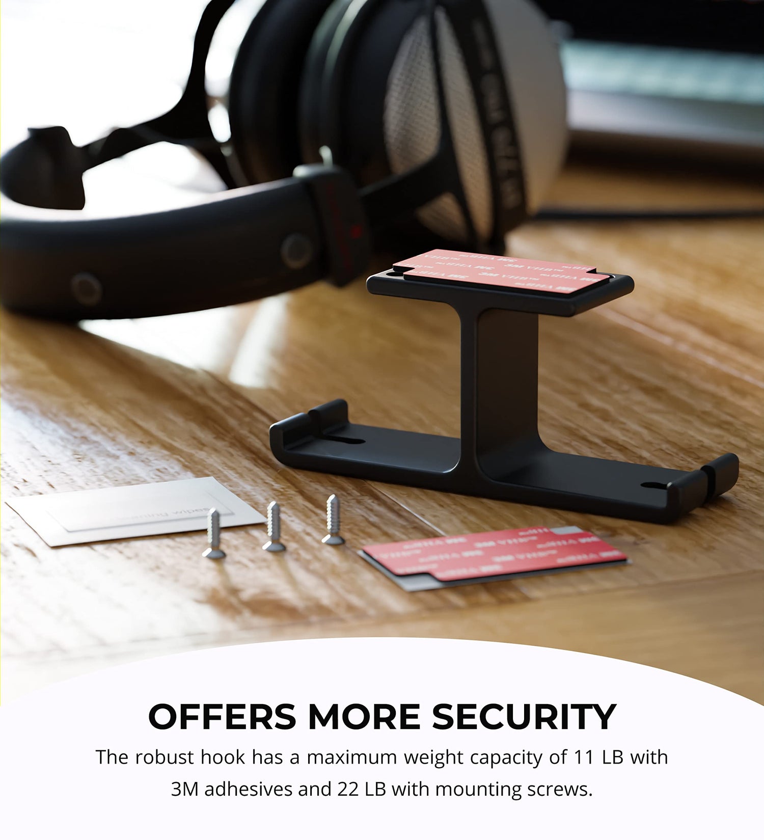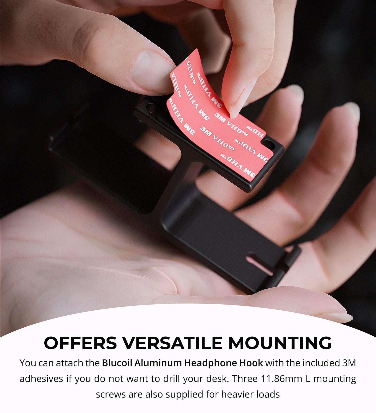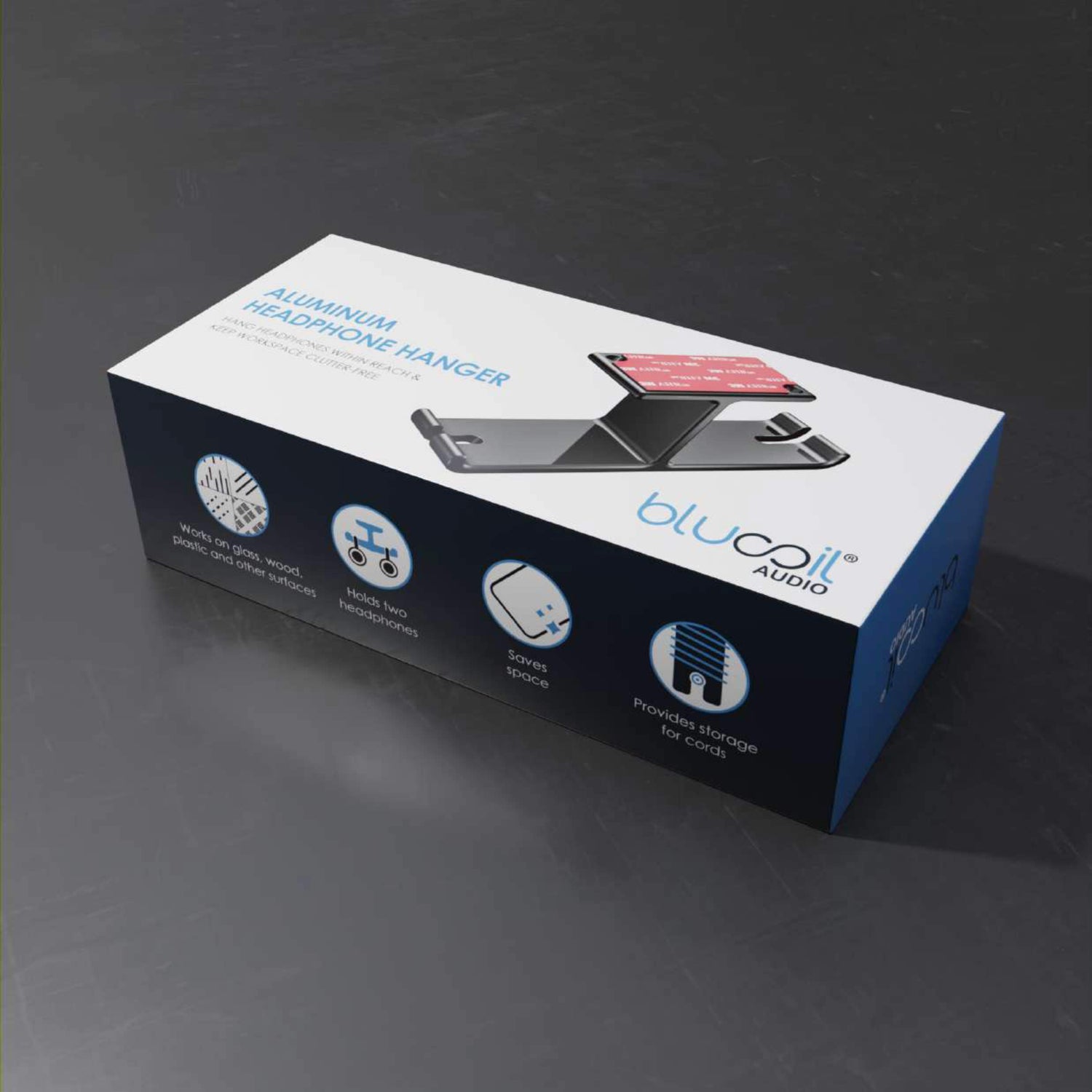 Details: Blucoil Aluminum Under-Desk Headphone Hook Declutter your computer desk from too many cords with the Blucoil Aluminum Under-Desk Headphone Hook. The dual headphone hanger maintains its shape, thanks to its solid all-metal aluminum construction. It can even hold 11 LB to 22 LB combinations of headsets and cables. You can confidently hang two pairs of heavy headphones, and the hook can easily support both. The aluminum hook comes with 3M adhesive pads and 3 x 11.86mm L Mounting Screws. You can instantly stick the headphone hook under the table with the adhesives. If you plan to hang heavier headsets and cords, the mounting screws are a great choice. The sleek black design looks great for any location such as home, office, school, or cyber cafe. TECHNICAL SPECS: Bottom Length: 3.94" Top Length: 1.97" Width: 1.1" Height: 1.77" Max Weight Capacity (with 3M Adhesives): 11 LB Max Weight Capacity (with Screws): 22 LB Product Weight: 0.12 LB Accessories Included: 3M Adhesives Pads; 3 x 11.86mm L Mounting Screws; LCD Cleaning Wipe.