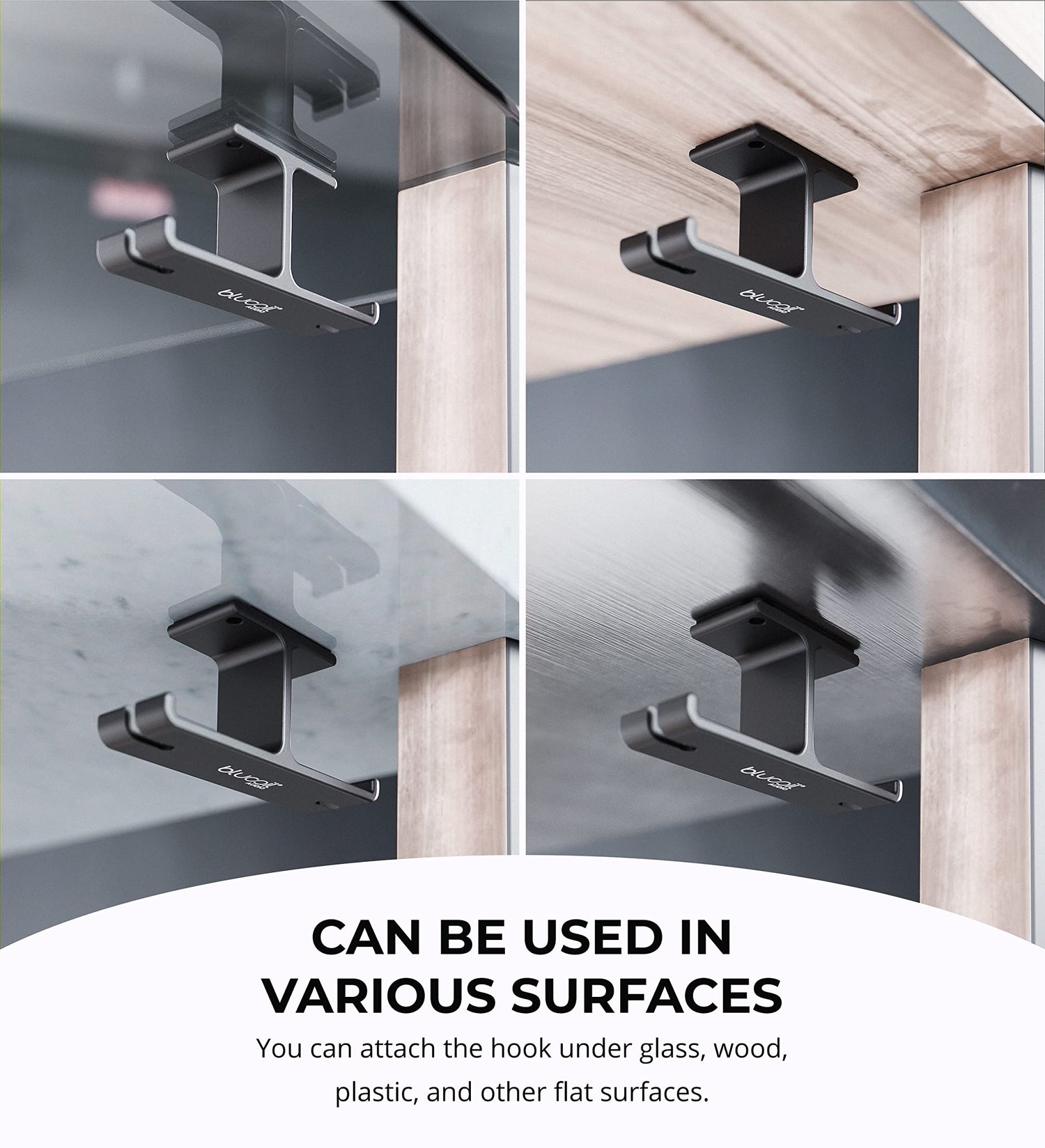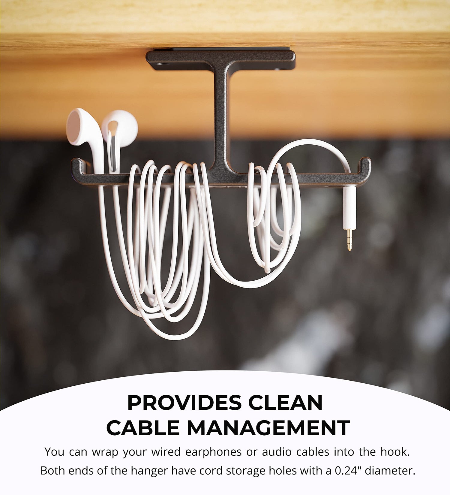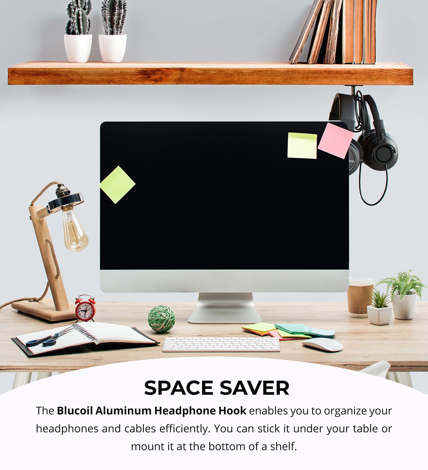 Details: Blucoil Aluminum Under-Desk Headphone Hook Declutter your computer desk from too many cords with the Blucoil Aluminum Under-Desk Headphone Hook. The dual headphone hanger maintains its shape, thanks to its solid all-metal aluminum construction. It can even hold 11 LB to 22 LB combinations of headsets and cables. You can confidently hang two pairs of heavy headphones, and the hook can easily support both. The aluminum hook comes with 3M adhesive pads and 3 x 11.86mm L Mounting Screws. You can instantly stick the headphone hook under the table with the adhesives. If you plan to hang heavier headsets and cords, the mounting screws are a great choice. The sleek black design looks great for any location such as home, office, school, or cyber cafe. TECHNICAL SPECS: Bottom Length: 3.94" Top Length: 1.97" Width: 1.1" Height: 1.77" Max Weight Capacity (with 3M Adhesives): 11 LB Max Weight Capacity (with Screws): 22 LB Product Weight: 0.12 LB Accessories Included: 3M Adhesives Pads; 3 x 11.86mm L Mounting Screws; LCD Cleaning Wipe.