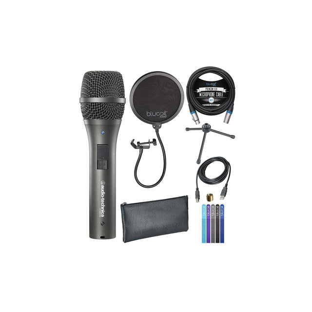 - INCLUDES - Audio Technica AT2005USB Cardioid Dynamic USB/XLR Microphone; Tripod Desk Stand; Stand Clamp for 5/8"-27 Threaded Stands; USB and XLR Cables. Blucoil 10-Foot Balanced XLR Cable - Premium Series 3-Pin Cable for Microphones, Speakers, and Pro Devices (Male-to-Female). Blucoil Audio Microphone Pop Filter Double Layer Mask Shield for Studio Recording and Broadcasting with Stand Clip Stabilization Arm, Swivel Mount. 5-Pack of Blucoil Reusable Velcro Cable Ties.