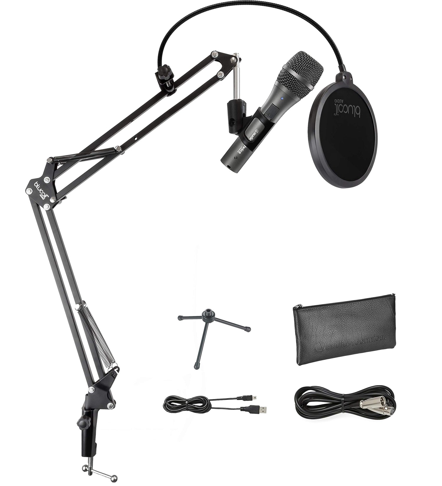 - INCLUDES - Audio Technica AT2005USB Handheld Cardioid Dynamic USB XLR Microphone. Desk Tripod Mic Stand. 2m Mini-USB Cable. 3m XLRF-to-XLRM Cable. Stand clamp for 5/8"-27 Threaded Stand. Blucoil All-in-One Microphone Boom Arm Plus Pop Filter.