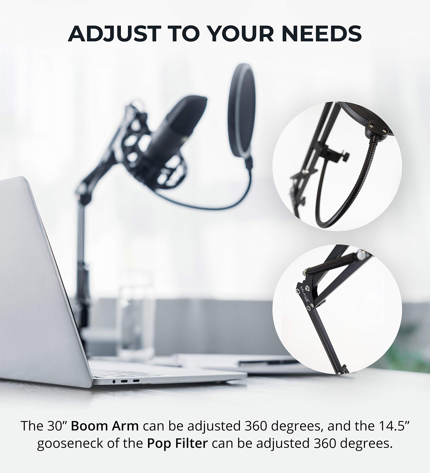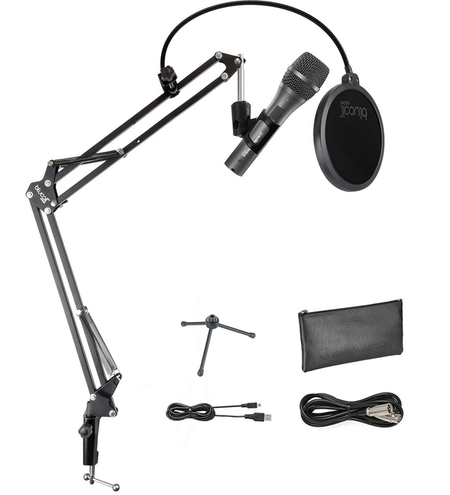 Details: Audio Technica AT2005USB USB / XLR Microphone The Audio Technica AT2005USB simplifies your miking applications with its versatile USB and XLR connections. The handheld dynamic microphone can be used with a PA system or computer. It captures excellent vocals and instruments. The headphone output comes with volume level control so you can directly monitor your mic. TECHNICAL SPECS Compatible With: MAC OS X or Windows XP/Vista/7/10 with USB 1.0 or 2.0 Ports and Minimum of 64MB Available RAM Element: Dynamic Polar Pattern: Cardioid Bit Depth: 16bit Sample Rate: 44.1 kHz/48 kHz Frequency Response: 50~15,000Hz Power Requirements: USB Power (5V DC) Connector: USB/XLR-type, 3.5mm TRS Stereo Headphones Headphone Output Power: 10mW at 16 Ohm Dimensions: 7.23" Long, 2.01" Diameter Weight: 266g Accessories: Desk Tripod Mic Stand, 2m Mini-USB Cable, 3m XLRF-to-XLRM Cable, Stand clamp for 5/8"-27 Threaded Stand Also Comes With: Blucoil Boom Arm Plus Pop Filter The Blucoil Boom Arm Pop Filter is designed to free your hands from always holding your microphone during studio recordings, podcasts, or live performances. The 30" long mic boom arm accommodates all kinds of microphones and shock mounts (3/8" to 5/8" threading adapter and microphone clip are included). It is made of heavy-duty steel and zinc alloyed parts. You can adjust the boom mic 360-degrees. The foldable boom arm comes with a removable Blucoil Pop Filter. The 2-layer mesh blocks the air blasted from the user's mouth and disperses any remaining air pressure. It effectively reduces hisses and environmental noise caused by plosive sounds. NOTE: Install the boom arm vertically for it to hold up the weight of a 3.3 lb microphone.