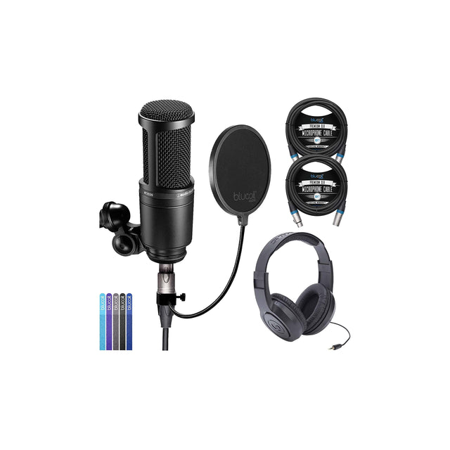 - INCLUDES - Audio Technica AT2020 Cardioid Condenser Microphone; Stand Mount for 5/8"-27 Threaded Stands; 5/8"-27 to 3/8"-16 Threaded Adapter; Soft Pouch. Blucoil Audio Microphone Pop Filter Double Layer Mask Shield with Stand Clip Stabilization Arm, Swivel Mount. 2-Pack of Blucoil 10-Foot Balanced XLR Cables - Premium Series 3-Pin Cable for Microphones, Speakers, and Pro Devices (Male-to-Female). 5-Pack of Blucoil Reusable Velcro Cable Ties. Samson SR350 Closed-Back Stereo Headphones.