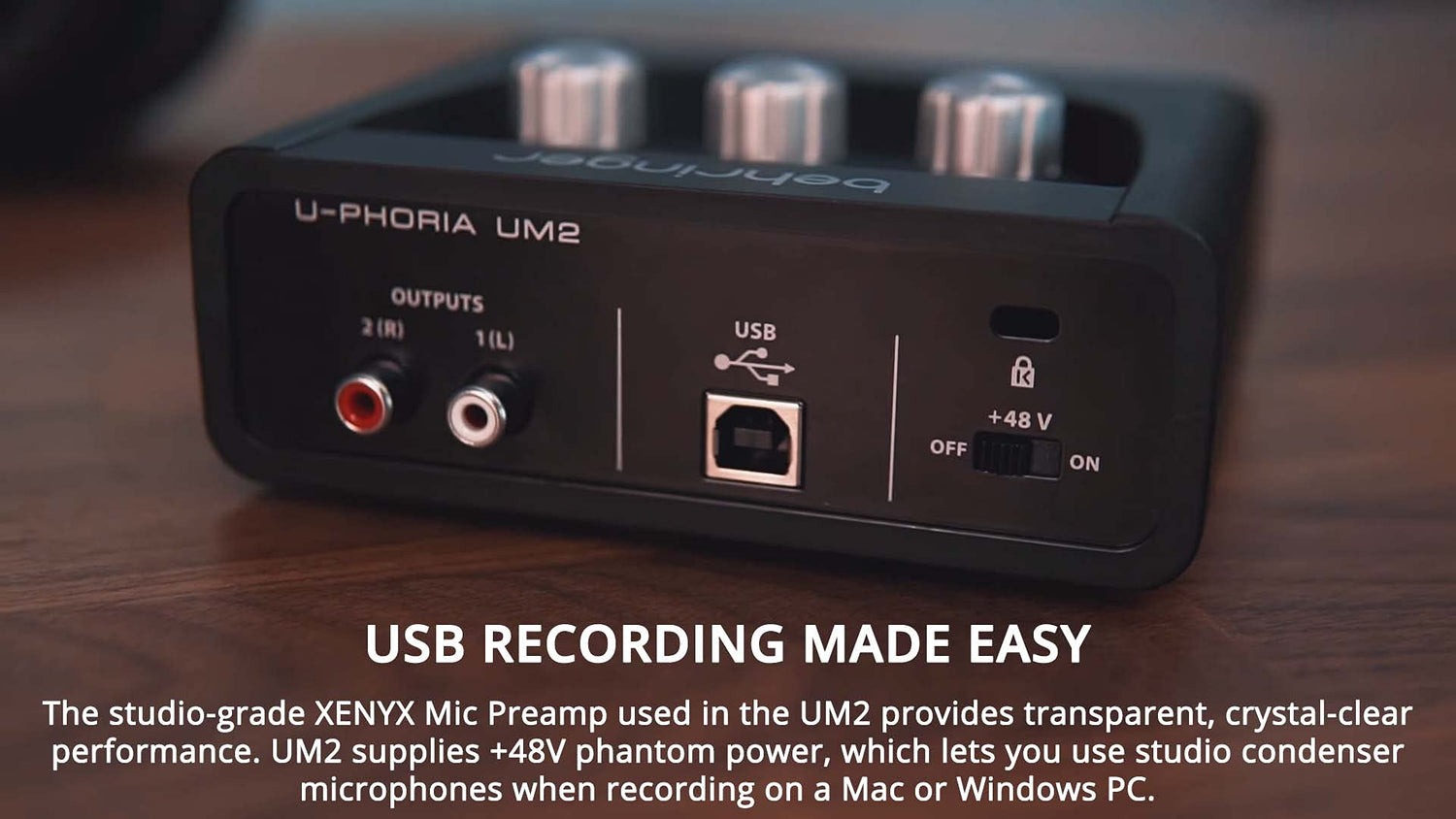 - RECORD EASILY WITH U-PHORIA - The UM2 lets you record your vocal performance as you play a keyboard or guitar. It has a combo input for line-level gears and microphones plus +48V phantom-powered XENYX Mic Preamp for studio condenser mics.