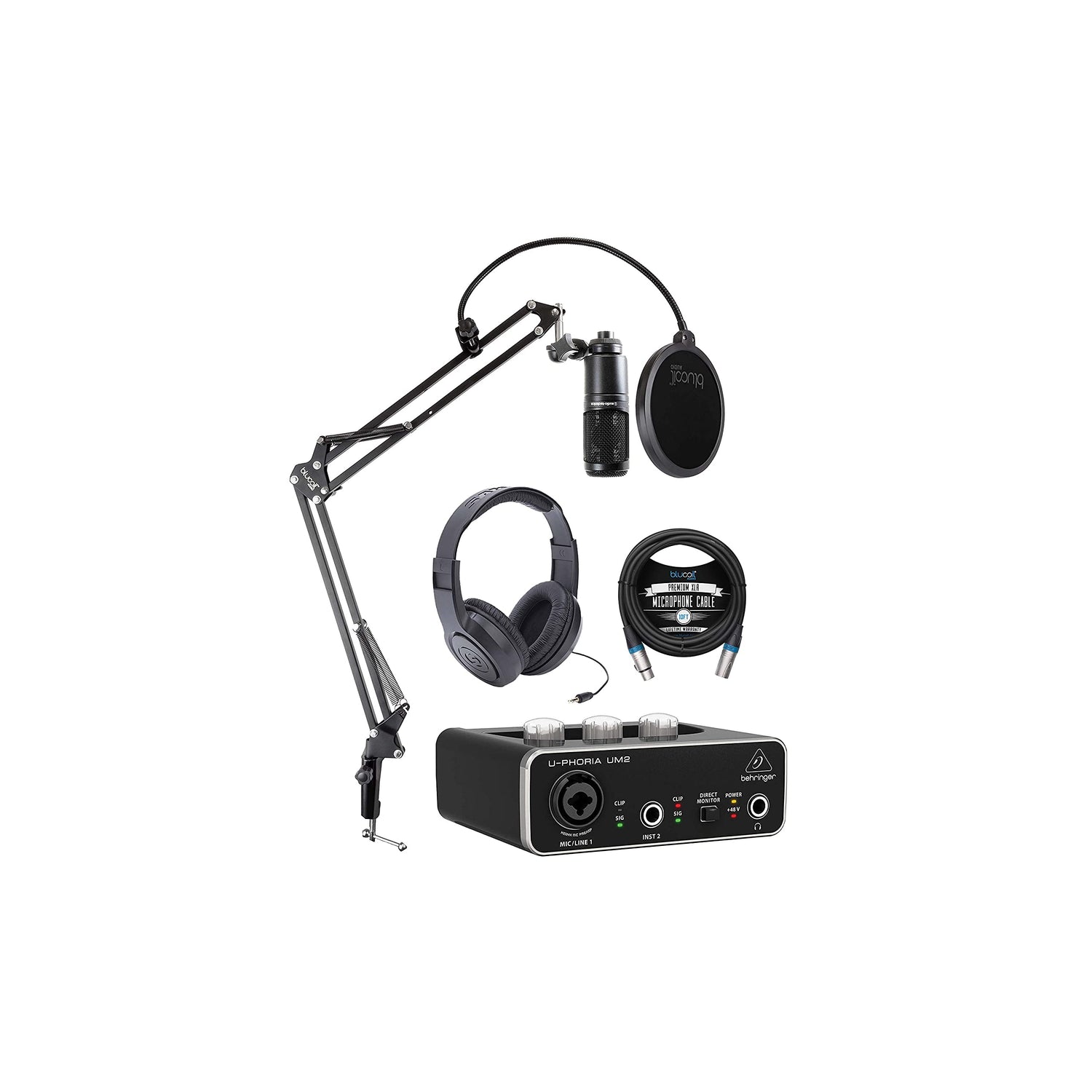 - INCLUDES - Audio Technica AT2020 Cardioid Condenser Microphone; Stand Mount for 5/8"-27 Threaded Stands; 5/8"-27 to 3/8"-16 Threaded Adapter; Soft Pouch. Behringer U-PHORIA UM2 USB Audio Interface with +48V Phantom Power. Samson SR350 Closed-Back Stereo Headphones. Blucoil All-in-One Microphone Boom Arm Plus Pop Filter. Blucoil 10-Foot Balanced XLR Cable - Premium Series 3-Pin Cable for Microphones, Speakers, and Pro Devices (Male-to-Female).