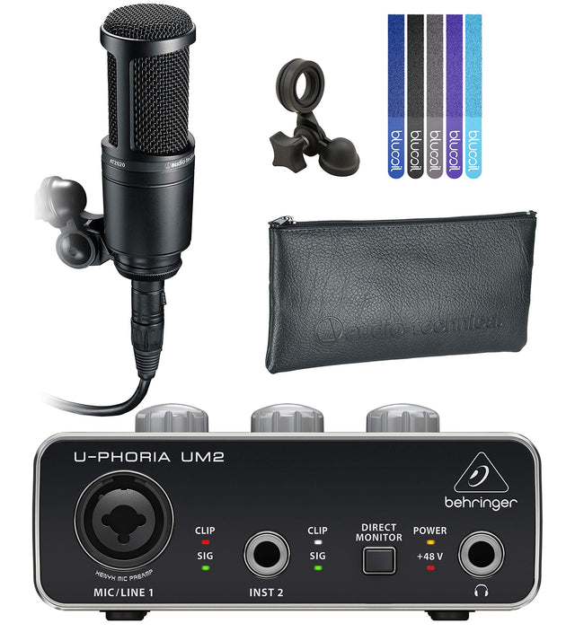 - INCLUDES - Audio Technica AT2020 Cardioid Condenser Microphone; Stand Mount for 5/8"-27 Threaded Stands; 5/8"-27 to 3/8"-16 Threaded Adapter; Soft Pouch. Behringer U-PHORIA UM2 USB Audio Interface with +48V Phantom Power. 5-Pack of Blucoil Reusable Velcro Cable Ties.