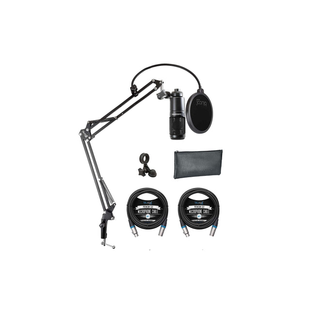 - INCLUDES - Audio Technica AT2020 Cardioid Condenser Microphone; Stand Mount for 5/8"-27 Threaded Stands; 5/8"-27 to 3/8"-16 Threaded Adapter; Soft Pouch. Blucoil All-in-One Microphone Boom Arm Plus Pop Filter. 2-Pack of Blucoil 10-Foot Balanced XLR Cables - Premium Series 3-Pin Cable for Microphones, Speakers, and Pro Devices (Male-to-Female).