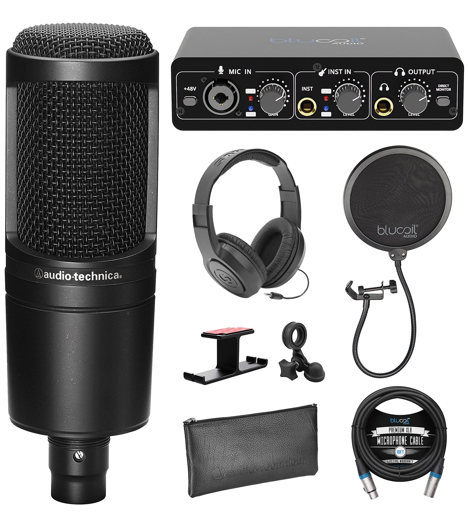 - INCLUDES - Audio Technica AT2020 Cardioid Condenser Studio XLR Microphone; Stand Mount for 5/8"-27 Threaded Stands; 5/8"-27 to 3/8"-16 Threaded Adapter; Soft Pouch. Blucoil Portable USB Audio Interface; USB Cable; 3M Adhesive Pads. Blucoil 10-Foot Balanced XLR Cable - Premium Series 3-Pin Cable for Mics & Pro Devices (Male-to-Female). Blucoil Audio Microphone Pop Filter with Stand Clip Stabilization Arm, Swivel Mount. Blucoil Aluminum Headphone Hook. Samson SR350 Closed-Back Stereo Headphones.