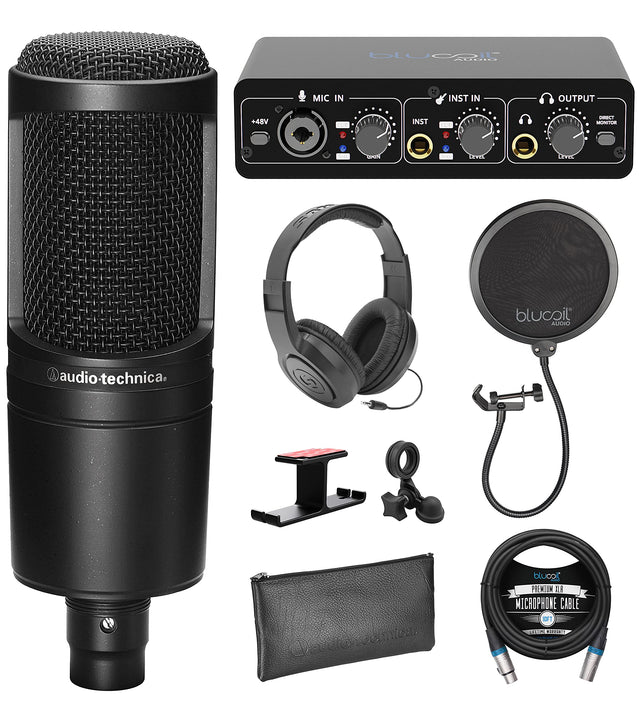 Details: Audio Technica AT2020 Condenser Microphone The Audio Technica AT2020 Condenser Microphone is well-suited for sophisticated audio recording with its 16mm low-mass diaphragm and wide dynamic range. It provides superior transient response and captures every sonic detail. The cardioid polar pattern offers better noise isolation and low 20dB self-noise reduces pickup of sounds. AT2020's high 144dB SPL handling makes it excellent to use for vocals and acoustic instruments. *NOTE: This condenser mic requires 48V phantom power to operate.TECHNICAL SPECS: Type: Condenser Required Phantom Power: 48V Polar Pattern: Cardioid Frequency Response: 20Hz-20kHz Max SPL: 144dB Dynamic Range: 124dB Self-Noise: 20dB SNR: 74dB Connector: XLR Size: 2.05" x 6.38" Weight: 0.76 LB Accessories: Stand Mount for 5/8"-27 Threaded Stands; 5/8"-27 to 3/8"-16 Threaded Adapter; Soft PouchAlso Comes With:Samson SR350 Closed-Back Stereo HeadphonesThe over-ear Samson SR350 Headphones feature 35mm drivers, which produces outstanding bass and 110dB sensitivity. It delivers 32 Ohm impedance and excellent noise isolation. You can use SR350 for monitoring audio recordings or casual listening thanks to its wide 20Hz-20kHz frequency range.Blucoil Portable USB Audio InterfaceMake the best audio recording with the Blucoil USB Audio Interface. It uses high-quality mic preamps and digital converters to deliver CD-quality 24bit/48kHz resolution across the 20Hz-20kHz frequency range. You can use it with any mic, instruments, or line-level devices thank to its switchable 48V phantom power. Easily stream tracks from the interface into your Mac/Windows. Blucoil also includes a USB cable and 3M adhesive pads in the package.Get this bundle today and receive these Blucoil exclusives: 10-Foot Balanced XLR Cable Microphone Pop Filter Aluminum Headphone Hook with 11-22 LB Weight Capacity