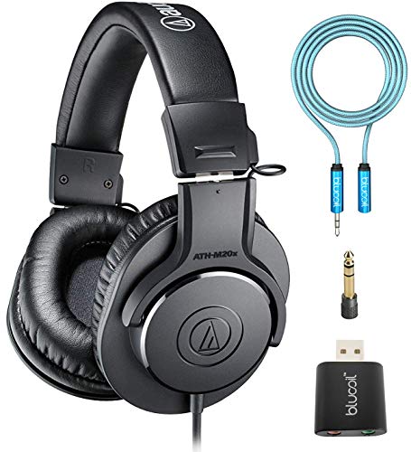 blucoil Audio Technica ATH-M20x Professional Studio Monitor Headphones, Black Bundle 6-FT Headphone Extension Cable (3.5mm), and USB Audio Adapter