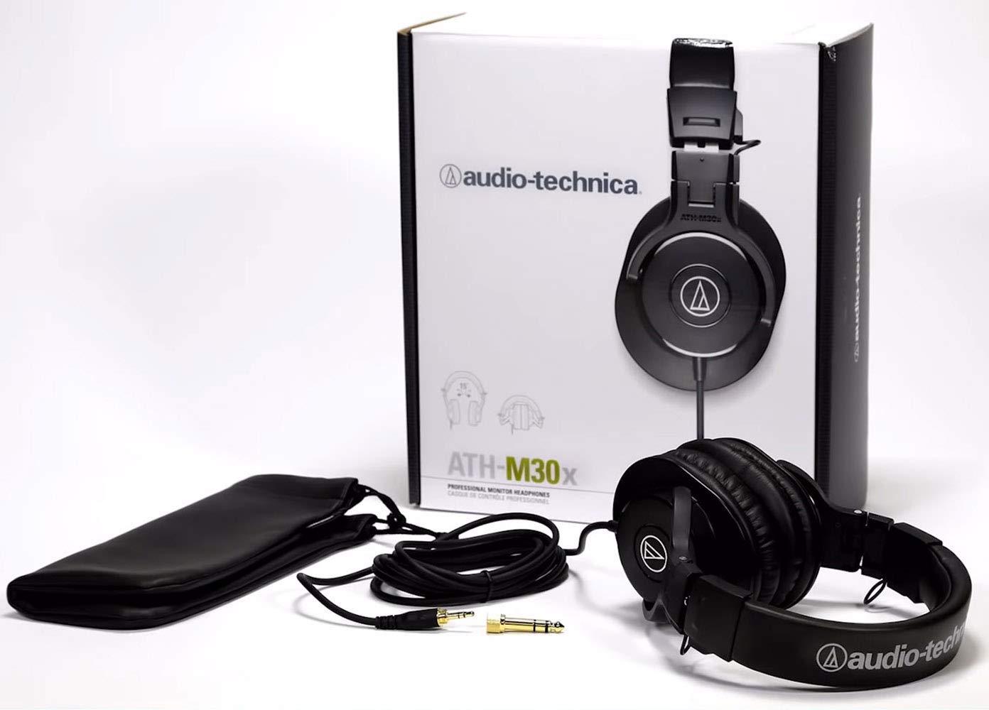 - INCLUDES - Audio-Technica ATH-M30x Professional Studio Monitor Headphones (Black); 1/4" Snap-On Adapter; Soft Carrying Pouch. Blucoil 6-Foot Premium Extension Cable with Stereo 3.5mm Tips. Slappa Full-Sized HardBody Pro Headphone Case.