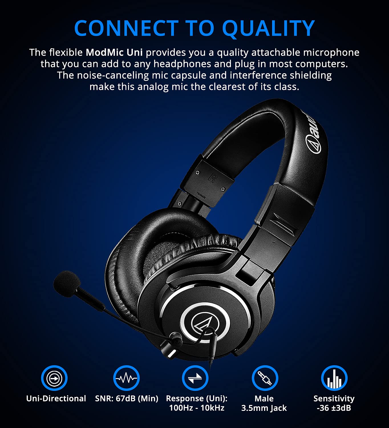 - ENHANCE YOUR HEADPHONES - The Audio ModMic Uni attaches to any flat surface easily. With the supplied magnetic clasps, you can transform ATH-M30x into the ultimate gaming/streaming headset. ModMic uses a premium unidirectional capsule to keep out unwanted noise and produces clear, crisp sounds.