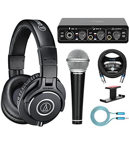 Details: Audio Technica ATH-M40x Professional Studio Monitoring Headphones Audio Technica presents a pro monitoring headphone with outstanding value in the sleek ATH-M40x Close-Back Headphones. ATH-M40x offers solid bass and accurate frequency response thanks to the onboard 40mm neodymium-magnet drivers. The 35 Ohm headphone provides superb sound isolation with minimal bleed. You can detach the cables and collapse the headband to save space in your gig bag. ATH-M40x is optimized for DJ monitoring, studio tracking, and mixing. TECHNICAL SPECS: Type: Closed-Back Dynamic Driver: 40mm Neodymium Magnet Voice Coil: Copper-Clad Aluminum Wire Impedance: 35 Ohm Frequency Response: 15Hz-24kHz Weight: 0.5 LB Accessories: 1/4" Adapter, Soft PouchAlso Comes With:Blucoil Portable USB Audio InterfaceMake the best audio recording with the Blucoil USB Audio Interface. It uses high-quality mic preamps and digital converters to deliver CD-quality 24bit/48kHz resolution across the 20Hz-20kHz frequency range. The bus-powered audio interface accepts mics, instruments, and line-level devices. You can use it with condenser microphones thanks to its switchable 48V phantom power. Easily stream tracks from the interface into your Mac/Windows computer. Blucoil also includes a USB cable and 3M adhesive pads in the package.Samson R21S Dynamic MicrophoneThe Samson R21S Microphone provides exceptional vocal miking applications with its high gain output and low impedance. It has a cardioid capsule that picks up all the nuances of your vocal performance while reducing unwanted feedback. R21S features an 80Hz-12kHz frequency range and includes an XLR to 1/4" microphone cable plus a removable mic clip.Get this bundle today and receive these Blucoil exclusives: 6-Foot Premium Extension Cable with Stereo 3.5mm Tip Aluminum Headphone Hook with 11-22 LB Weight Capacity 10-Foot Balanced XLR Cable