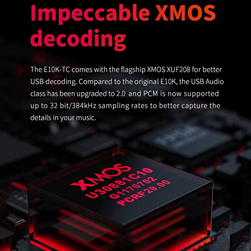 - OFFERS BETTER DECODING - The Fii O E10K TC Headphone Amp is now equipped with an XMOS XU208 USB controller. It is paired with the classic PCM5102 DAC chip to decode PCM signals up to 32bit/384kHz and deliver a flatter frequency response.
