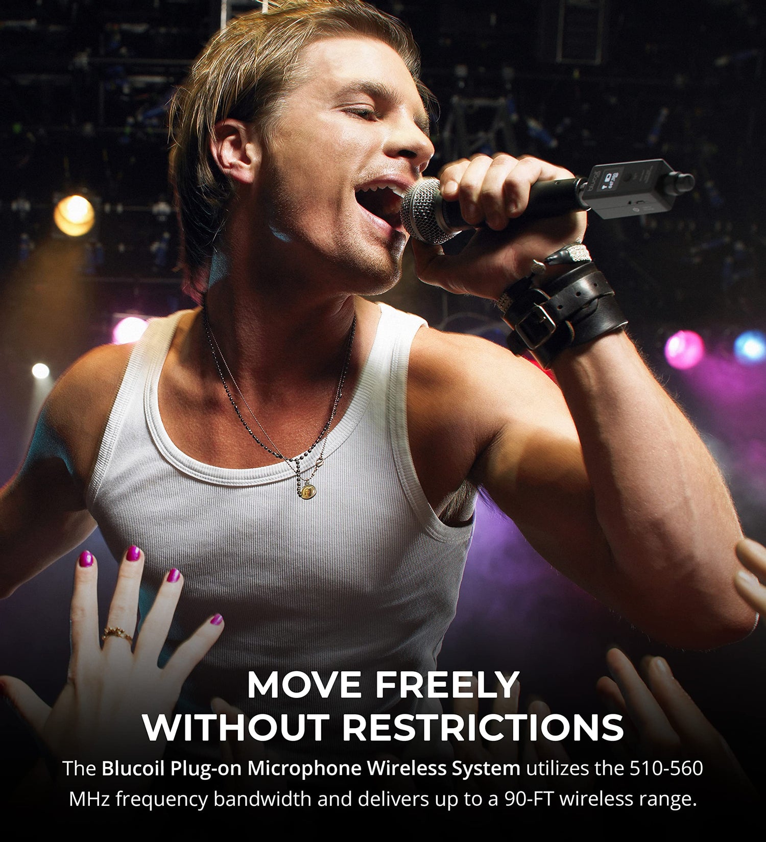 - NO MESSY CABLES - The Blucoil Plug-on Microphone Wireless System gives you the freedom to record/perform while moving across the studio or stage. The XLR mic transmitter can communicate to the receiver even if they're 90-feet apart.