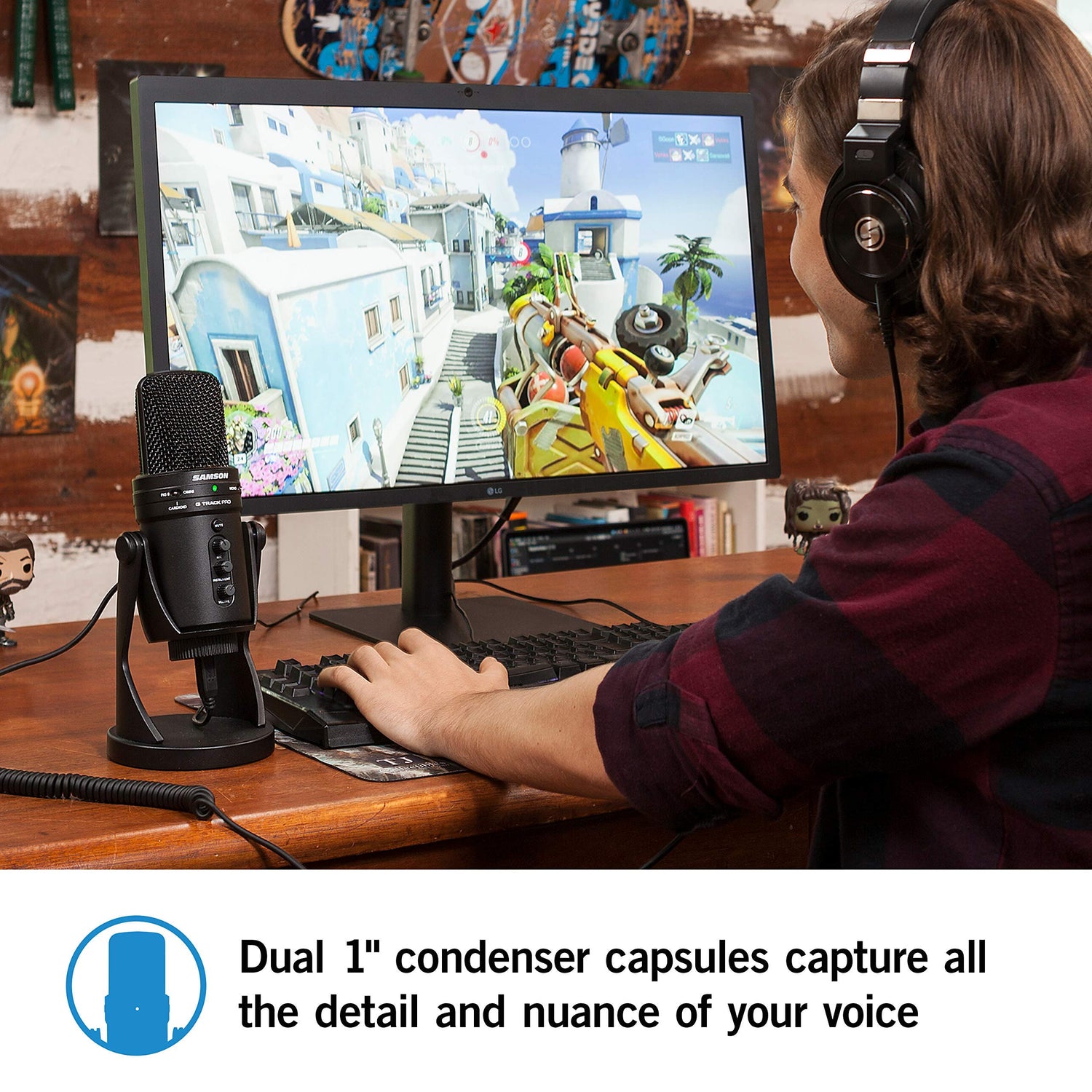 Details: Samson G-Track Pro Microphone The all-in-one Samson G-Track Pro Microphone lets you record your voice or instrument straight to a computer. It features 3 selectable polar patterns and an onboard audio interface that delivers up to 24bit/96kHz audio resolution. You can directly monitor your electric guitar, bass, piano, or drum machine thanks to the onboard headphone amp. The built-in mixer offers input level controls for the Mic and Instrument. You can easily set clean signals for recording. TECHNICAL SPECS: Compatible with: Windows, Mac OS X A/D Resolution: Up to 24bit/96kHz Sound Field: Mono (Mic/Instrument Mixed), Stereo (Mic/Instrument Separate Tracks) Polar Patterns: Omnidirectional, Cardioid, Bidirectional Frequency Response: 50Hz-20kHz Sensitivity: +6dB FS/Pa Max SPL: 120dB Impedance: 16 Ohm Headphones, 1 MOhm Inst In Connectors: 1/4" Instrument Input, 1/8" Stereo Headphones, USB-B Power Source: USB Bus PowerAlso Comes With:Blucoil Portable USB Audio InterfaceMake the best audio recording with the Blucoil USB Audio Interface. It uses high-quality mic preamps and digital converters to deliver CD-quality 24bit/48kHz resolution across the 20Hz-20kHz frequency range. The bus-powered audio interface accepts mics, instruments, and line-level devices. You can use it with condenser microphones thanks to its switchable 48V phantom power. Easily stream tracks from the interface into your Mac/Windows computer. Blucoil also includes a USB cable and 3M adhesive pads in the package.Blucoil 3-FT USB 2.0 Type-A Extension CableThe Blucoil extension cable features a USB 2.0 Type-A termination with male-to-female connectors. It enables you to connect your USB microphone or mixer 3-feet away from a PC. Even at long-distance, this cable offers less electrical resistance and fast data signal travel thanks to its 28 AWG/24AWG copper conductors.