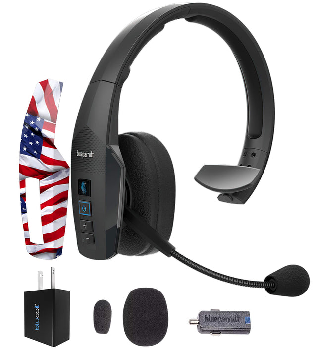 - INCLUDES - BlueParrott B450-XT BPB-45020 Noise Canceling Bluetooth Headset; Charging Cable; Auto Charger; Foam Ear Cushion; Mic Windscreen. MightySkins Removable Headphone Decal Sticker (Patriot). Blucoil USB Wall Adapter 5V 1000mA (Model No. KA25-0501000US).