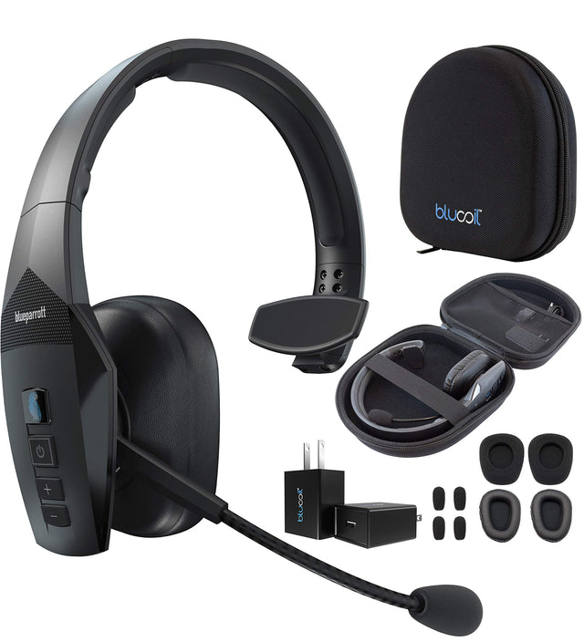 - INCLUDES - BlueParrott B450-XT BPB-45020 Noise Canceling Bluetooth Headset; USB-C Charging Cable; Auto Charger; Foam Ear Cushion & Spare Mic Windscreen. Blucoil Headphones/Headset Carrying Case. Blucoil Replacement Ear Pad Cushions and Microphone Windscreens Kit for Blueparrott Headsets. Blucoil USB Wall Adapter 5V 1000mA (Model No. KA25-0501000US).