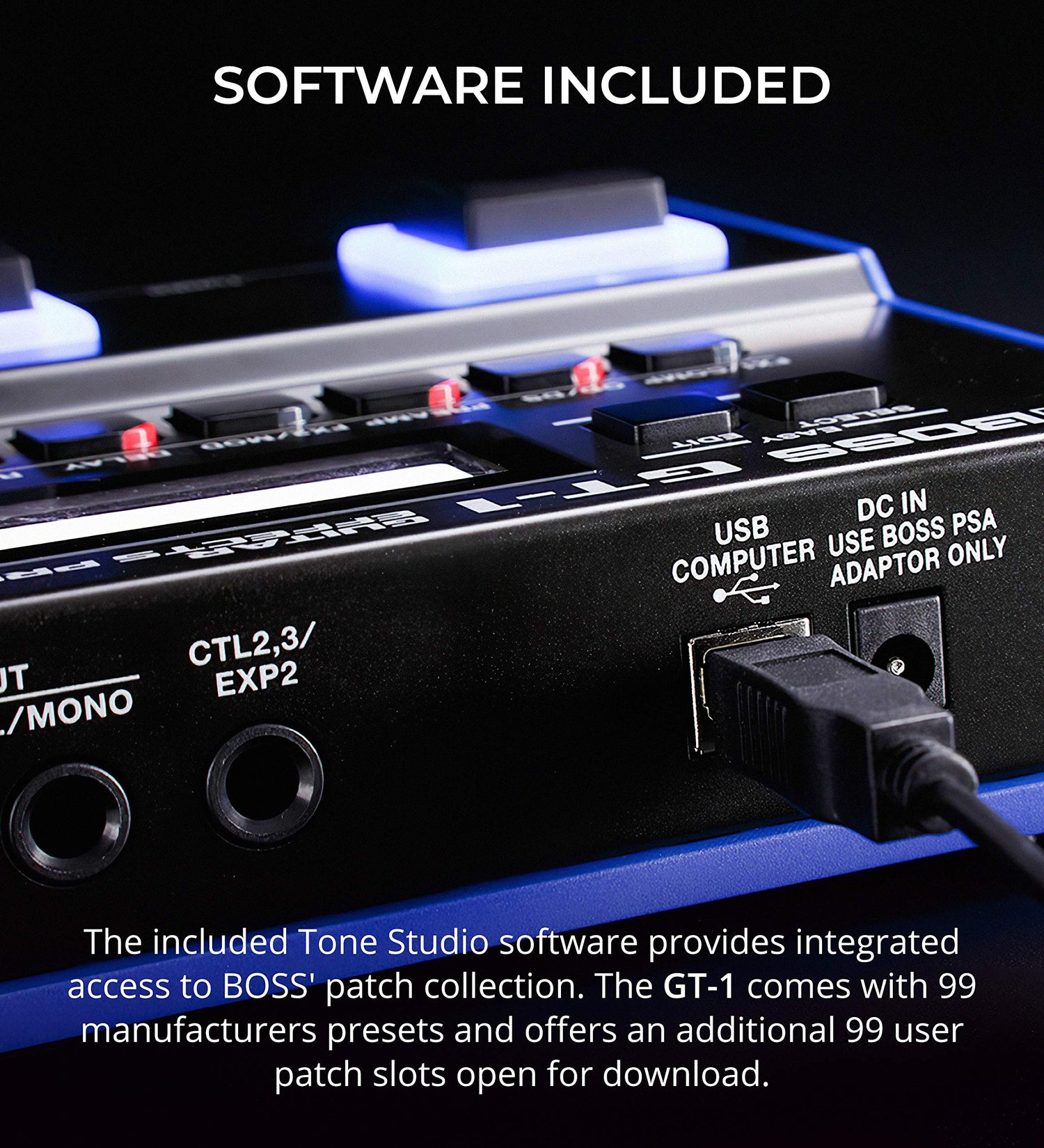 - COMES WITH BOSS TONE STUDIO SOFTWARE - The free Tone Studio editor/librarian gives you integrated access to BOSS' patch collection. The GT-1 boasts 99 manufacturers presets and offers 99 user patch slots you can download at BOSS Tone Central.