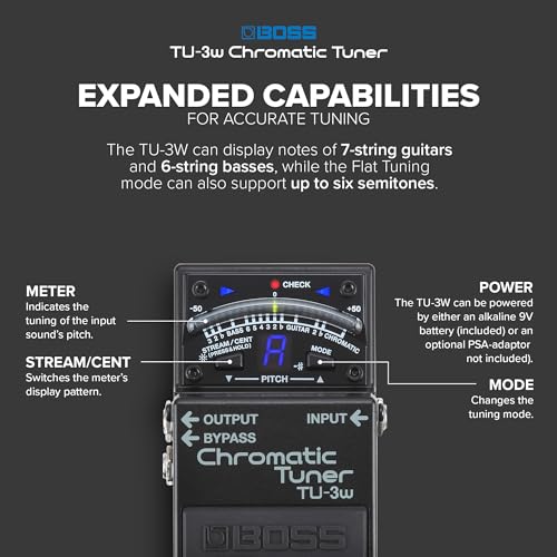 Details: Product Description BOSS WAZA Craft Chromatic Tuner Stompbox (TU-3W) From the Manufacturer Since the beginning, the engineers at BOSS have been committed to achieving the finest guitar tones using any technology necessary, from old-school analog circuits to high-tech DSP. Continuing this enthusiastic spirit, we are pleased to introduce the Waza Craft series. In Japan, “Waza” is the term for art and technique, and these special edition pedals proudly carry the Waza symbol to represent the pinnacle of BOSS design and craftsmanship. With final sound approval carried out by BOSS in Japan, the Waza Craft series brings you exceptional tone and touch response through carefully selected analog components, refined circuitry, and meticulous attention to detail.