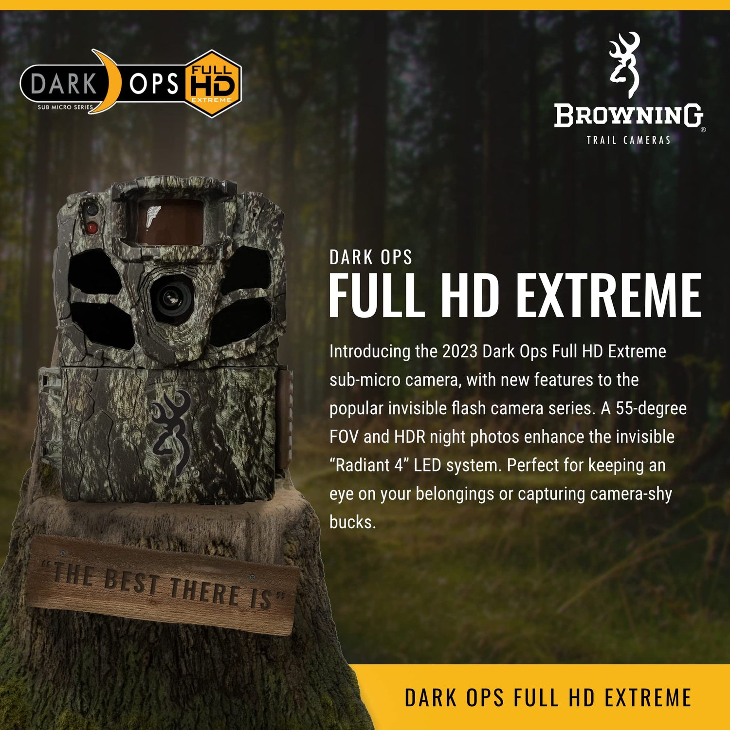 Details: The Browning Dark Ops Full HD Extreme sub-micro camera continues to expand the feature set on the industry's most popular invisible flash camera series. By adding a 55-degree FOV to the camera and HDR night photos to the invisible "Radiant 4" LED system, users will experience nighttime images and videos like never before. Its adjustable trigger speed offers you the chance to customize your experience based on your personal preferences. It also has 24 MP image and 1080p Full HD video capabilities, a unique SD Card Management feature, a Smart IR Video setting, and Browning's industry-defining battery life. It is equipped to provide the most complete trail camera experience in the market for just the right price. | CAMERA FEATURES: 24 MP, Flash Range Extends up to 90 ft, 0.135 – 0.7 Second Adjustable Trigger Speed, 4 High-Power Infrared LEDs for Night Illumination 1080p Full HD Videos with Sound (5 sec. - 2 min. in Length), 55 Degree Camera FOV, HDR Night Images, Invisible Infrared LED Nighttime Illumination, 80 ft. Adjustable Detection Range, 0.5 Second Recovery Time, "RADIANT 4" Night IR Illumination Adjustable Infrared Flash Options (Long Range, Fast Motion, Economy Modes), Illuma-Smart Technology Automatically Adjusts IR Flash for Perfect Nighttime Photos, SD Card Management, Long Battery Life from 6 AA Batteries (Not Included), Up to 8 Multi Shot Images, Up to 8 Rapid Fire Images, Smart IR Video, Selectable Start/Stop Image Timer, Programmable Picture Delay (1 sec – 60 min), Picture Info Bar Displays: Time, Date, Temperature, Moon Phase, Camera ID, Barometric Pressure, 12-Volt External Power Jack, Supports up to 512GB SDXC Memory Card (Not Included), 1/4" -20 Standard Tripod Socket, Battery Meter Functions with Alkaline, Rechargeable, or Lithium Batteries, Compact Case Size 4.25" x 3." x 2.5", Timelapse Plus Camera Mode with IR Triggered Images, Compatible with Browning Buck Watch Timelapse Viewer Software
