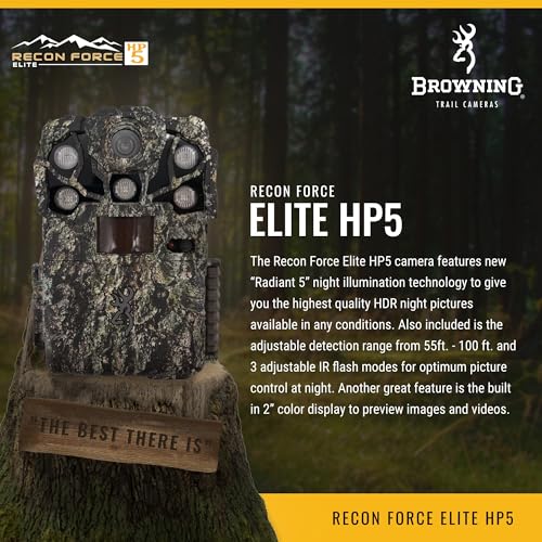 Details: Description The Recon Force Elite HP5 camera features new "Radiant 5" night illumination technology to give you the highest quality HDR night pictures available in any conditions. Also included is the adjustable detection range from 55ft. - 100 ft. and 3 adjustable IR flash modes for optimum picture control at night. Another great feature is the built in 2" color display to preview images and videos right in the field. The Recon Force Elite HP5 also features the highest quality 24 MP pictures and 1920 x 1080 Full HD video quality in either 30 or 60 frames per second for the most incredible video clips of game on your property. Additional features include Smart IR Video, which continues to record video footage while game is moving in front of the camera and SD Card Management Options which allow you to overwrite older images on the SD Card if the memory is full. The Recon Force EDGE HP5 is also compatible with up to 512 GB SDXC memory cards.