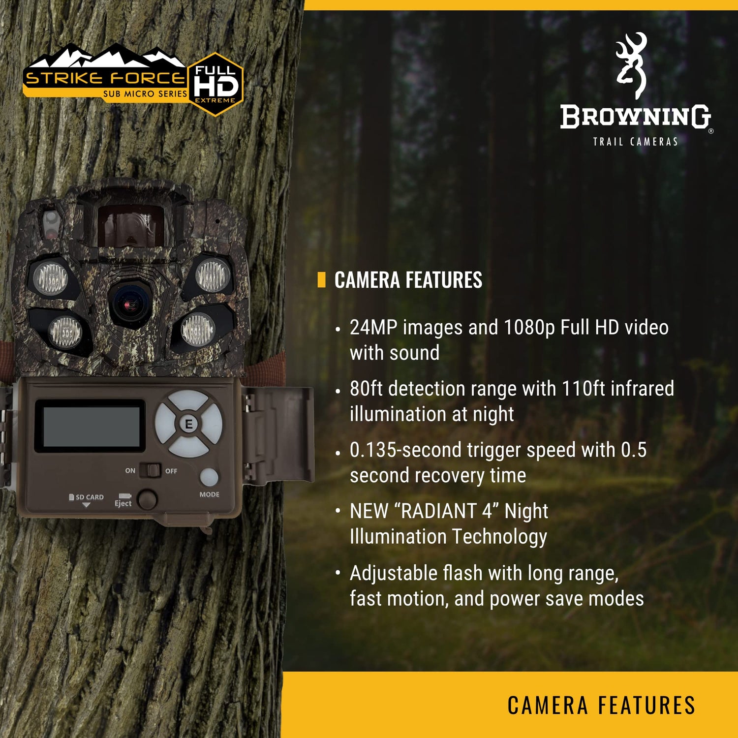 Details: The Browning Strike Force Full HD Extreme trail camera features cutting-edge Radiant 4 flash technology that delivers the finest in nighttime illumination while offering a customizable experience. It delivers greater power efficiency in Economy mode, longer flash ranges in High Power Mode and faster shutter speeds in Fast Motion mode. The nighttime HDR picture enhancement engine allows you to capture even better nighttime images at long ranges. The adjustable trigger speed allows you to choose the trigger speed that is right for your camera's location, from 0.135 to 0.7 seconds. With 24 MP picture capability, a video processor that produces 1080p full HD video clips with sound, a robust 80-foot detection range, Illuma-Smart flash technology, and the best battery life on the market, it's easy to see why Browning Trail Cameras are simply are The Best There Is. | CAMERA FEATURES: 24MP, 110 ft. Flash Range, 0.135 – 0.7 sec Adjustable Trigger Speed, 4 High Power Infrared LEDs for Night Illumination, 1080p Full HD Videos with Sound (5 sec. - 2 min. length), HDR Night Images, 80 ft. Adjustable Detection Range, 0.5-sec Recovery Time, "RADIANT 4" Night IR Illumination, Adjustable Infrared Flash options (Long Range, Fast Motion, Economy modes), Illuma-Smart Technology Automatically adjusts IR Flash for Perfect Night Photos, SD Card Management, Long battery life from 6 AA batteries (Not Included), Up to 8 Multi Shot Images, Up to 8 Rapid Fire Images, Smart IR Video, Selectable Start/Stop Image Timer, Programmable Picture Delay (1 sec. – 60 min.), Picture info bar displays: Time, Date, Temperature, Moon Phase, Camera ID, 12-Volt External Power Jack, Supports up to 512GB SDXC Memory Card (Not Included), 1/4" -20 Tripod Socket, Battery Meter Functions with Alkaline, Rechargeable, or Lithium Batteries, Compact Case Size 4.25" x 3." x 2.5", Timelapse Plus Camera Mode with IR Triggered Images, Compatible with Browning Buck Watch Timelapse Viewer Software