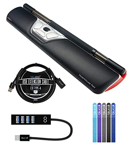 Contour Design RollerMouse Red Wireless - Wireless Ergonomic Mouse fo Mac and Windows PC Bundle with Blucoil USB-A Mini Hub, 3-FT USB 2.0 Type-A Extension Cable, and 5-Pack of Reusable Cable Ties