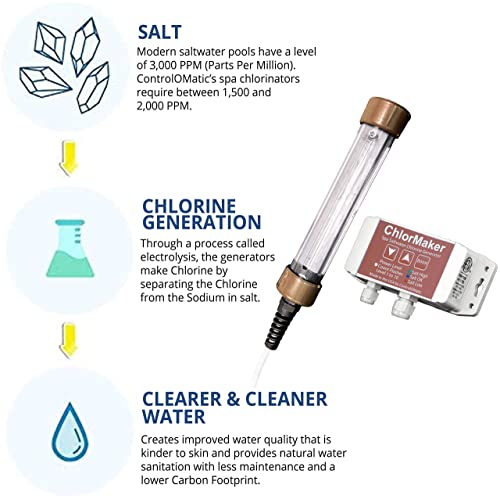 Details: ControlOMatic ChlorMaker Saltwater Chlorine Generation System ChlorMaker is a semi-automated, saltwater chlorine generation system that produces chlorine from a small amount of ordinary salt dissolved in the water. It generates up to 30g of pure chlorination per day. You only need to add a very small amount of salt with a high water volume level. The small addition of salt provides a softening effect on your spa water. It is less harsh than chemical pool water sanitizer. ChlorMaker utilizes self-cleaning reverse polarity technology to help reduce calcium buildup. Features: 10 Adjustable Power Levels Chlorine Boost Mode Salt Level Indicator Technology Vacation ModeWhat's in the Box? ChlorMaker Cell ChlorMaker Control Box 5.5V 3A Power Supply with 100-240V, 50/60 Hz AC InputAlso Comes With:Insta-TEST Pool & Spa Test Strips (3 Bottles)The Insta-TEST features 50 test strips that measure the concentration of free available chlorine accurately and instantly. It helps in testing the strength and efficacy of chlorine-based sanitizers. The "dip-n-read" strips are packaged in a waterproof bottle. You can measure the water's Free Chlorine (0-10 ppm), Bromine (0-20 ppm), Total Alkalinity (0-240 ppm), pH 6.2-9.0, and Total Hardness (0-800 ppm) with Insta-TEST.ControlOMatic SpaSaltBlend Pink Himalayan SaltControlOMatic's SpaSaltBlend contains 1 pound of pure pool salt and mineral-fortified Pink Himalayan Salt blend. It is designed for use with spa saltwater chlorine generators. SpaSaltBlend features a pinkish tint enriched in nutrients and minerals. The Pink Himalayan Salt is considered the purest salt, virtually free of toxins and pollutants. ControlOMatic's special blend re-mineralizes the body.USAGE: Dissolve 1.5 cups of SpaSaltBlend per 100 gallons for 1500 PPM NaCl. Allow more time for the dissolution.