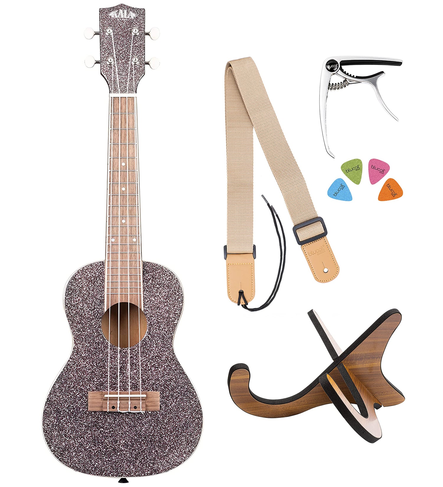 - INCLUDES - Kala KA-SPRK-PINK Sparkle Pink Champagne Concert Ukulele with Walnut Fretboard and Aquila Super Nylgut Strings. Blucoil Audio Ukulele Accessories Kit: Adjustable 28" - 48" Leather Strap; 4-Pack of Blucoil Felt Picks (Assorted Colors); Portable Stand for Ukuleles under 3.5" in Depth; Zinc Alloy Capo for Ukuleles and Guitars.