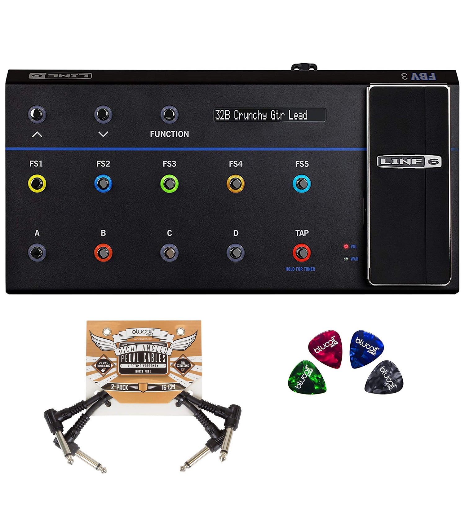 - INCLUDES - Line 6 FBV 99-040-2805 FBV 3 Pedalboards Foot Controller. 2-Pack of Blucoil Right-Angled Patch Cables for Effects Pedals. 4-Pack of Blucoil Celluloid Guitar Picks with 0.71mm Gauge (Assorted Colors).
