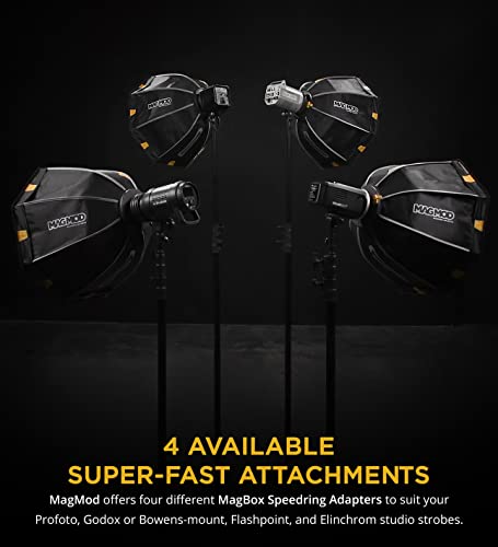 - QUICK SET UP AND TEAR DOWN - Once you've slid in the Speed Ring Adapter on your Bowens strobe mount, simply attach the MagBox Softbox. The super-strong neodymium magnets inside MagBox Pro Octa or Grid's base make attachment fast and easy.