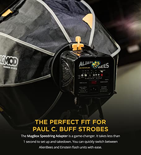 Details: MagMod MagBox Speedring Adapter for Elinchrom The MagMod MagBox Speedring Adapter transforms your softbox into a versatile soft light source. It uses spring-loaded tabs to securely lock in your Bowens, Paul C. Buff, Elinchrom, or Profoto strobe mounts. Once the adapter is in place, magnetically attach your MagBox Original 24" Octa Softbox, MagBox PRO 42" Octa, or the MagBox PRO 36" Grid Softbox into the adapter. No noisy velcro tapes or tacky adhesive strips are required. You can set it up or tear it down in seconds! The neodymium magnets inside the Octa and Grid Softboxes make attachment fast and easy. You can tilt the softbox at any angle, and the MagBox system will just stay put.