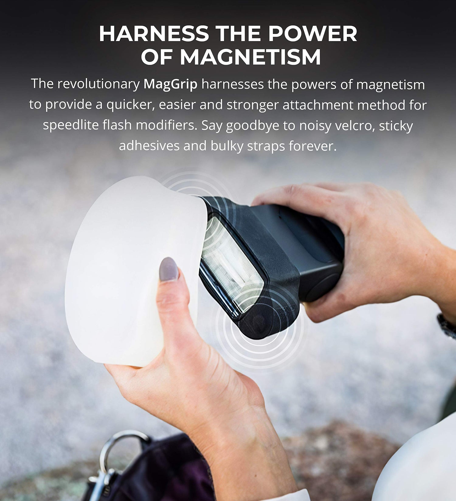 The revolutionary MagGrip harnesses the powers of magnetism to provide a quicker, easier and stronger attachment method for speedlite flash modifiers. Say goodbye to noisy velcro, sticky adhesives and bulky straps forever.