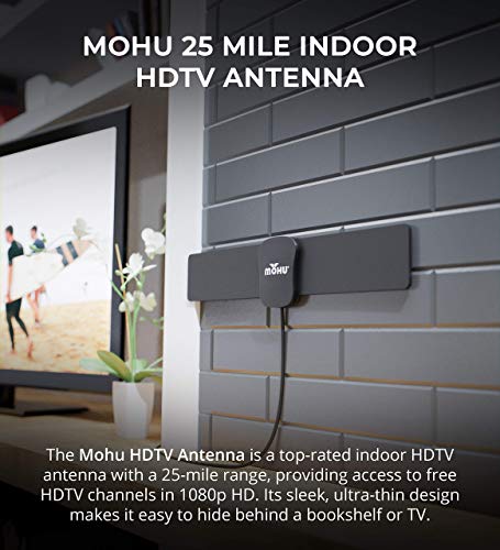 Details: MOHU Basic25 Indoor HDTV Antennas (3-Pack) The MOHU Basic25 is a low-cost, no-frills indoor TV antenna that gives you access to over-the-air (OTA) channels without a cable subscription. It offers a 10-mile VHF-range and 25-mile UHF-range. You can watch over-the-air HDTV channels in full 1080 HD at no cost. (NOTE: Basic25 offers access to free OTA channels only, NOT paid channels like ESPN.) The channel reception is 100% dependent on the local terrain. You can watch popular TV programs in clear video resolution if there are no obstructive posts or walls in between the antenna and broadcast tower. Simply plug in the 10-FT coaxial cable on your analog/digital television or TV tuner and mount the "Leaf" at the back of your television or bookshelf. Compared to other antennas, Basic25 offers an unobtrusive design. No need to worrying about "pointing" or exposed antenna parts. The MOHU Basic25 is an excellent indoor antenna for homes, dorms, offices, and pantries. Get this bundle today and receive 5-Pack of Reusable Velcro Cable Ties!