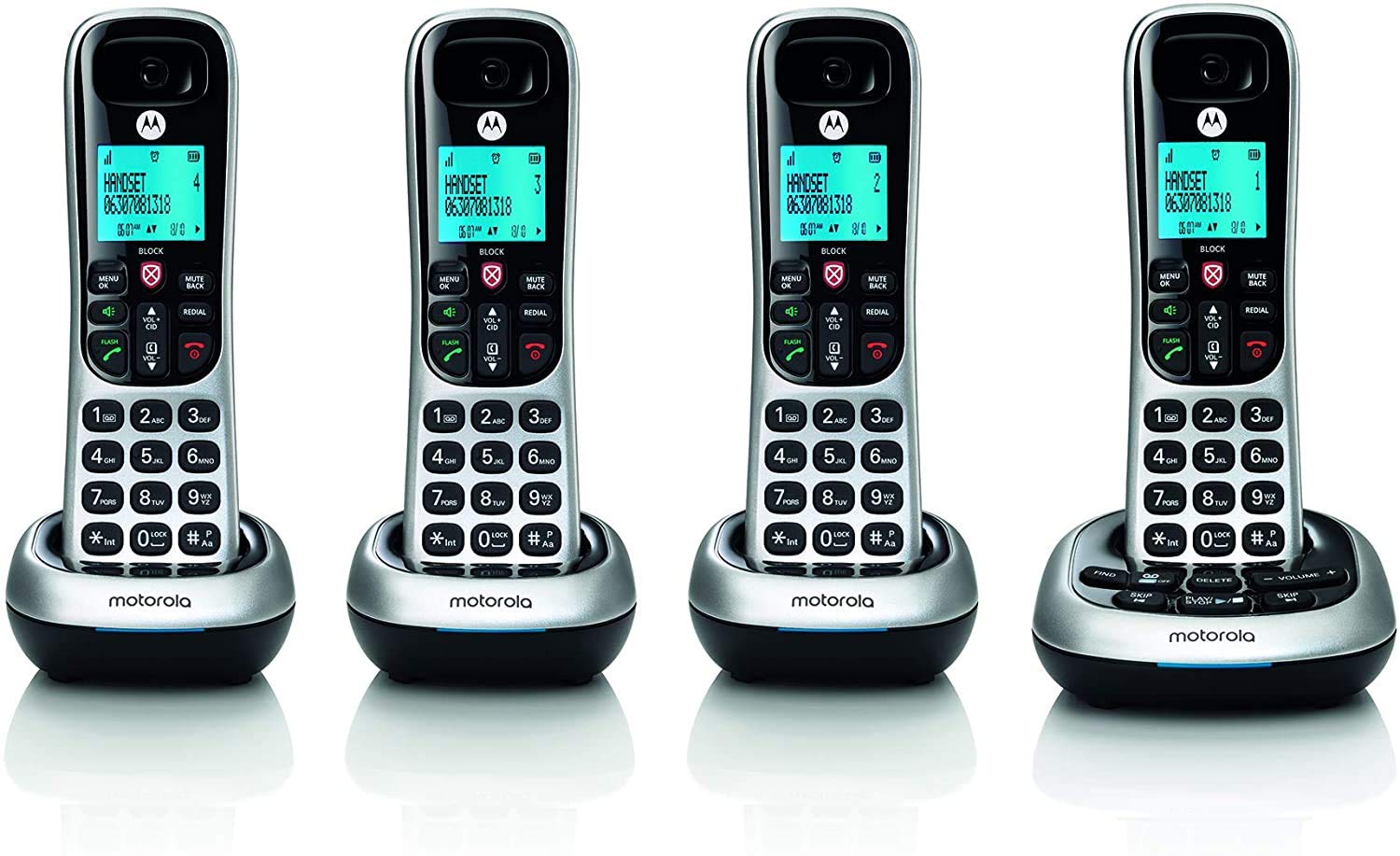 Details: Motorola CD4014 DECT 6.0 Cordless Phone - 4 Handsets The Motorola CD4014 consists of four CD4 cordless handsets that operate in an interference-free DECT 6.0 range. The base accepts up to four paired CD4 handsets. Freely move around the house by activating the hands-free speakerphone. Need instant silence? The CD4014 telephones are equipped with a mute button. CD4014's base docks are equipped with a switchable answering machine. You can record up to 12 minutes of memo for the other users at home. An incoming caller can also leave a message for you. CD4014 is the ideal cordless telephone for the modern home. Motorola supports Caller ID / Call waiting. *NOTE: You need to subscribe first to your Network Service provider's Call Waiting CID services.FEATURES AND SPECS: Up to 12 Minutes of Digital Recording Time Blocks up to 10 Nuisance Numbers Base accepts up to 4 Handset Expansions Microphone Mute Option Hands-Free Speakerphone 50 Name/Number Phonebook Directory 10 Polyphonic Ringer Melodies 3-Way Conference Calls Intercom Paging Bright Blue Backlit Display Laser-Etched Backlit Keypad Power Source: AC Power Battery, Rechargeable 750mAh Ni-MH Battery Cells Charging Time: 16 HoursAlso Comes With:Blucoil 10-FT 1 Gbps Cat5e CableThe Blucoil Cat5e Cable efficiently transfer signals from a network router to your telephone or TV tuner. It supports large networks running at 1GB/s and features non-corrosive Micron Gold Plated RJ45 connectors plus a 24 AWG Gauge. The ANSI/TVI-568-C.2 standard cable offers lesser electrical resistance and reduces the crosstalk amount.Get the CD4014 Bundle today and receive 5-Pack of Blucoil Reusable Velcro Cable Ties!