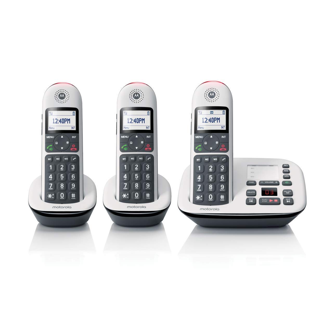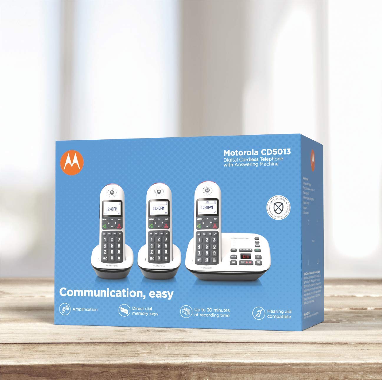 Details: Motorola CD5013 DECT 6.0 Cordless Phone - 3 HandsetsThe Motorola CD5013 consists of three CD5 cordless handsets that offer high-performance audio for residents with hard of hearing. One handset offers 5 levels of amplification and Equalization to provide clearer conversations. CD5013 provides up to 10dB of volume boost and Hearing Aid Type 3.3+ compatibility. The CD5013 operates in an interference-free DECT 6.0 range. You can register up to four (4) cordless handsets with one (1) base. Hold a 3-way conference call or make intercom calls with other handsets. The base dock is also equipped with an answering machine. An incoming caller can record up to 30 minutes of messages. Motorola also supports Call waiting with Caller ID. You can filter incoming calls without picking up the line. *NOTE: You need to subscribe first to your Network Service provider's Call Waiting CID services.FEATURES AND SPECS:Up to 30 Minutes of Digital Recording TimeBlocks up to 10 Nuisance NumbersBase accepts up to 4 Handset Expansions5 Levels of Volume Amplification (Up to 10dB)Hearing Aid Compatible (with Type 3.3+ HAC)3 Memory Number Directory3-Way Conference CallsIntercomVisual Ring IndicatorBright Backlit Display and KeypadPower Source: AC Power Battery, Rechargeable 750mAh Ni-MH Battery CellsCharging Time: 16 HoursAccessories Included: Telephone Line Cord, Charging CradleAlso Comes With:Blucoil 10-FT 1 Gbps Cat5e CableThe Blucoil Cat5e Cable efficiently transfer signals from a network router to your telephone or TV tuner. It supports large networks running at 1GB/s and features non-corrosive Micron Gold Plated RJ45 connectors plus a 24 AWG Gauge. The ANSI/TVI-568-C.2 standard cable offers lesser electrical resistance and reduces the crosstalk amount.Get the CD5013 Bundle today and receive 5-Pack of Blucoil Reusable Velcro Cable Ties!