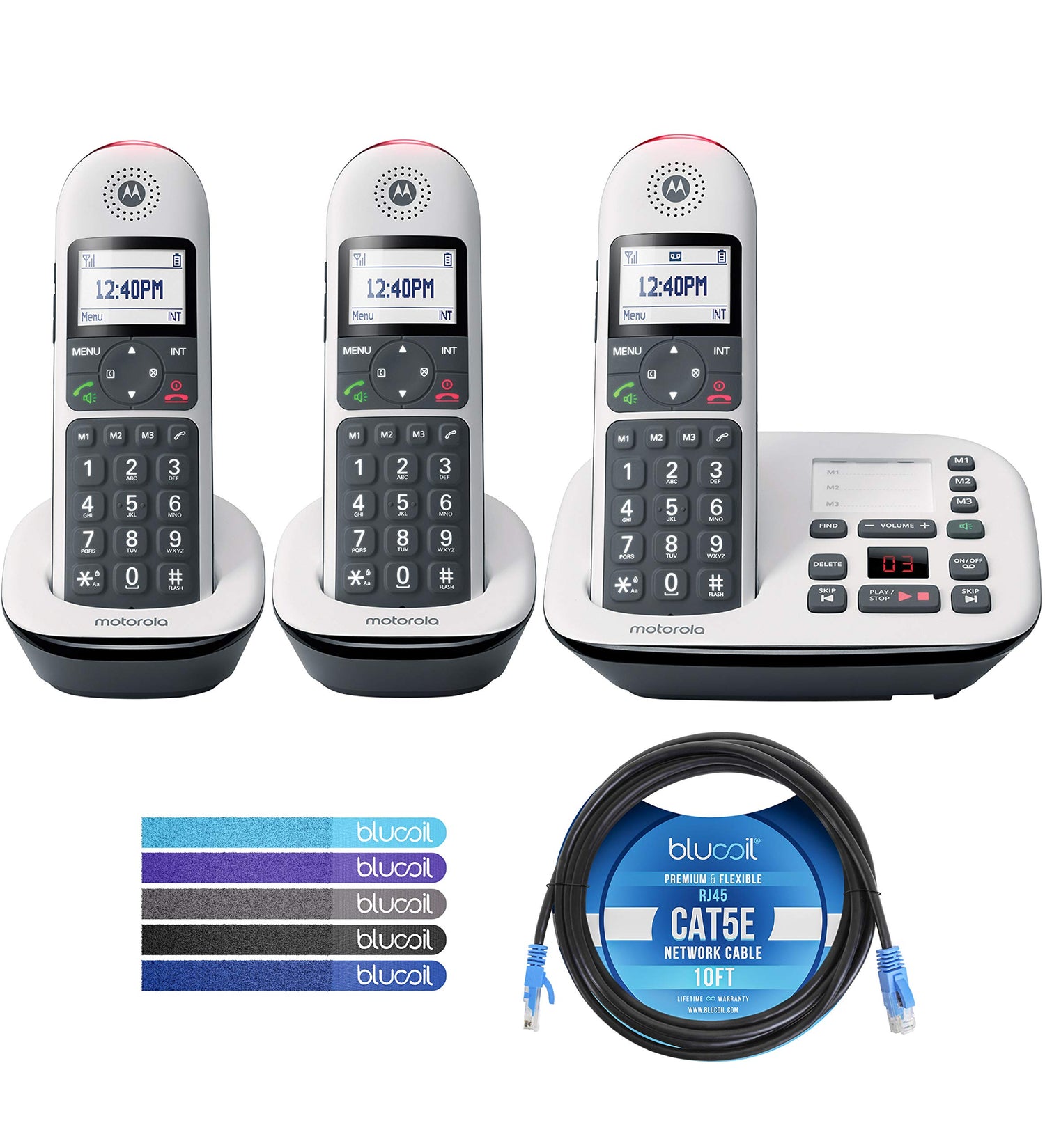 Motorola CD5013 DECT 6.0 Cordless Phone with Digital Answering Machine, Call Block, and 10dB Amplification (3-Pack) Bundle with Blucoil 10-FT 1 Gbps Cat5e Cable, and Reusable Cable Ties (5-Pack)