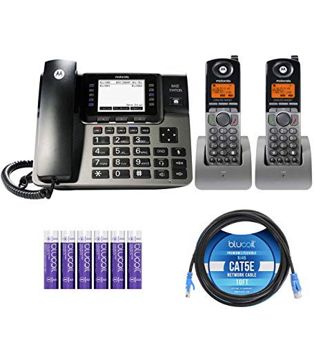 Details: Motorola ML1002H 4-Line Phone System - ML1000 Base StationThe Motorola ML1000 Base Station supports 4 analog landlines and a full-duplex speakerphone. You and your employees can use the internal lines for communicating inside the office, while the external lines are for contacting customers. ML1000 is equipped with an automated Digital Receptionist that greets callers when you can't pick up the ringing line. *NOTE: You must subscribe first to your phone provider's Call Waiting Caller ID service to display the caller's name/number on the telephone screen, .FEATURES :No. of Lines: 4Frequency: DECT 6.0Expandable Extensions: 10Data Transmission: Full Duplex SpeakerphoneFunctions: 99 Names/Numbers Directory, 10 Number Speed Dialing, Digital Receptionist and Answering System, Conference Calls, Intercom, Supports Call Waiting Caller ID ServicePower Source: Power Adapter or 5 AAA BatteriesAccessories: Power Adapter, 4x2-Line Phone CordsAlso Comes With:Motorola ML1200 Cordless Handsets (2-Pack)Expand your phone system at home or in the office with Motorola ML1200! The wireless handset operates in DECT 6.0 frequency, ensuring no call dropouts and zero signal interference. You can add up to 10 handsets on the ML1000 Base Station. No need for you to get additional landline phone cords. Simply connect ML1000 into the phone jack and pair ML1200 to the base station. Wirelessly connect cordless handsets in an instant!Blucoil 10-FT 1 Gbps Cat5e CableThe Blucoil Cat5e Cable efficiently transfer signals from a network router to your telephone or TV tuner. It supports large networks running at 1GB/s and features non-corrosive Micron Gold Plated RJ45 connectors plus a 24 AWG Gauge. The ANSI/TVI-568-C.2 standard cable offers lesser electrical resistance and reduces the crosstalk amount.Get this bundle today and receive 6-Pack of Blucoil 1.5V AAA Alkaline Batteries!