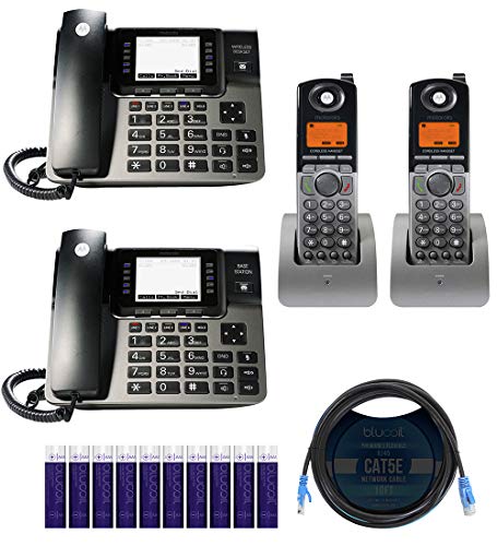 - INCLUDES - Motorola ML1000 DECT 6.0 4-Line Base Station; Power Adapter; 4x2-Line Phone Cords. Motorola ML1100 Wireless Desk Phone; Power Adapter. Motorola ML1200 Cordless Handset with Charging Dock. Blucoil 10-Foot Cat5e UTP Cable with RJ45 Connectors - 24 AWG Wire Copper. 10-Pack of Blucoil 1.5V AAA Alkaline Batteries.