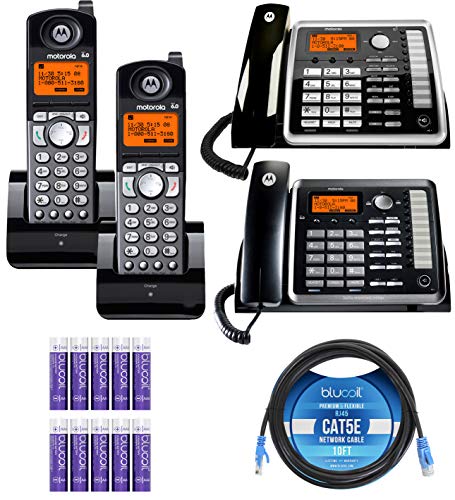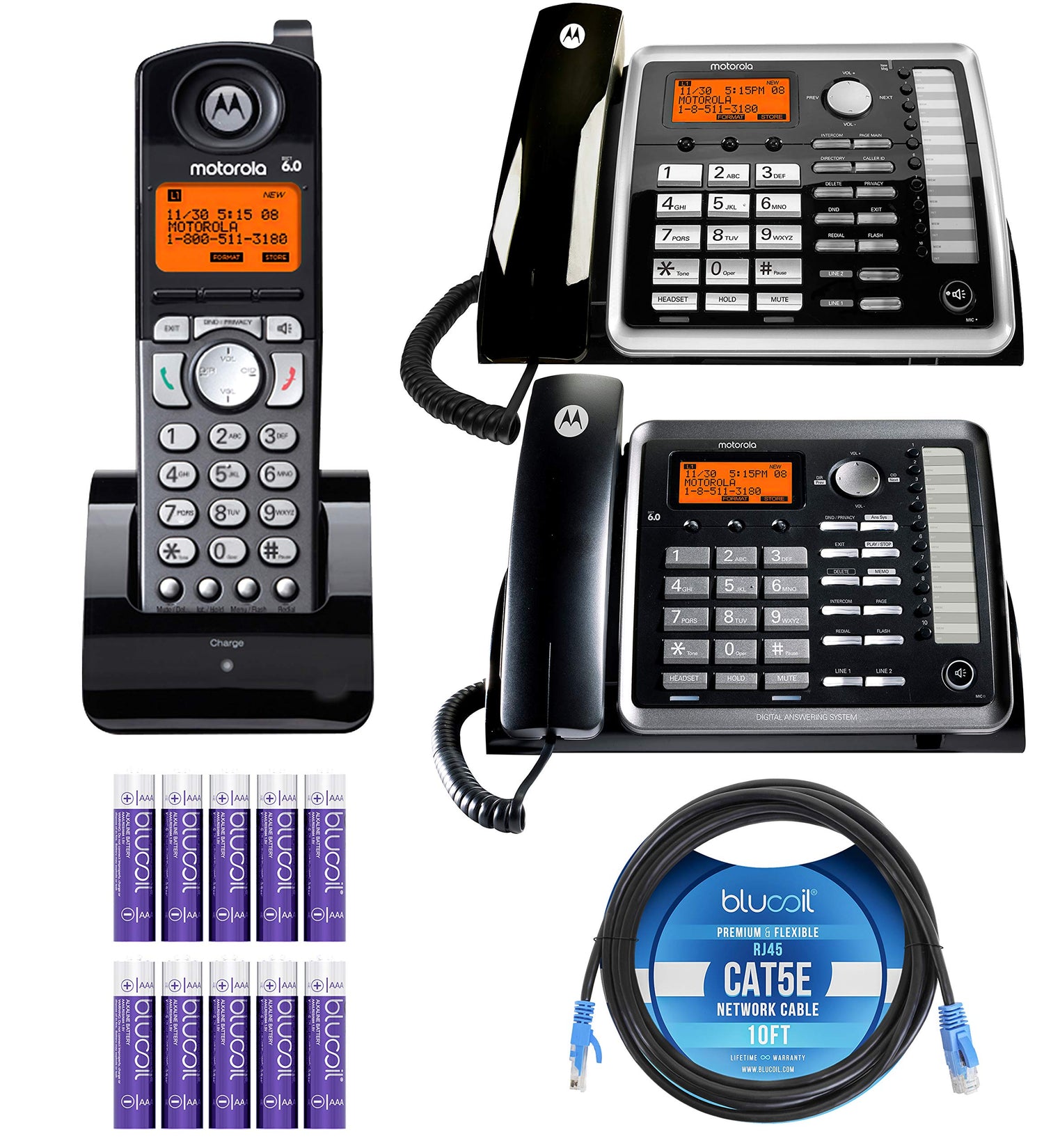 - INCLUDES - Motorola ML25254 2-Line Corded Phone Base Station; AC Power Adapter; 2-Line Phone Cords; Wall Mount Phone Cable. Motorola ML25260 2-Line Corded Phone Base Station/Add-On Extension; AC Power Adapter; 2-Line Phone Cords; Wall Mount Phone Cable. Motorola ML25055 2-Line DECT 6.0 Cordless Handset with Charging Dock. Blucoil 10-Foot Cat5e UTP Cable with RJ45 Connectors - 24 AWG Wire Copper. 10-Pack of Blucoil 1.5V AAA Alkaline Batteries.