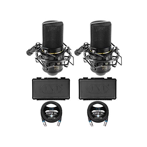 - INCLUDES - 2-Pack of MXL 770 Cardioid Condenser Microphones (Black); Shock Isolation Mount; Rugged Carry Case. 2-Pack of Blucoil 10-Foot Balanced XLR Cables - Premium Series 3-Pin Cable for Microphones, Speakers, and Pro Devices (Male-to-Female).