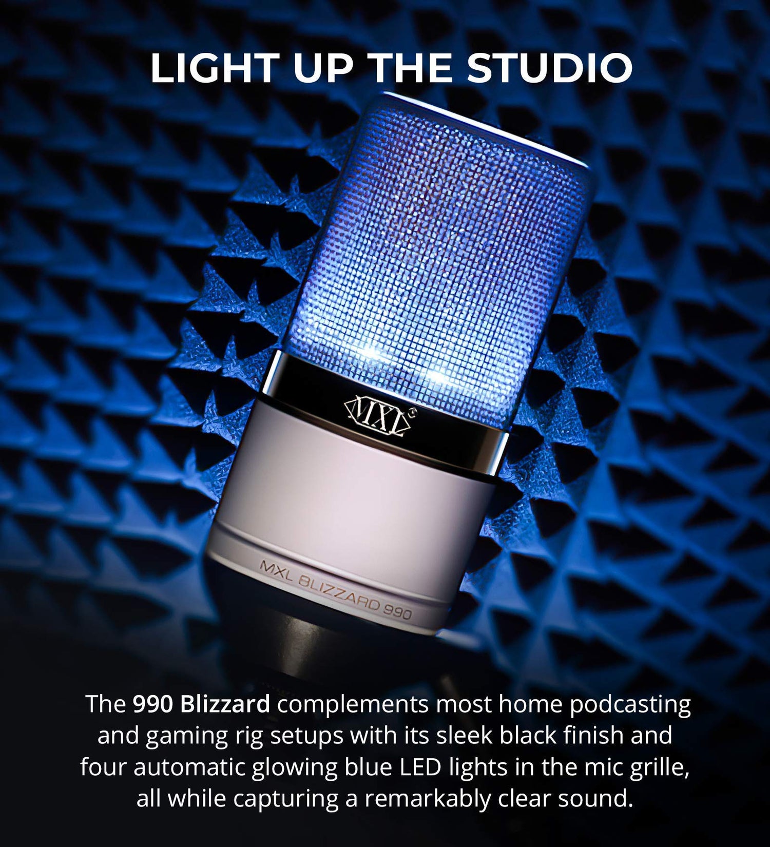 - OFFERS A COOL GLOW FEATURE - Upgrade your computer set-up and light up your desk MXL 990's chilling blue light. There 4 built-in LED bulbs inside the mic grille automatically light up when you plug the mic in an audio interface or preamp.