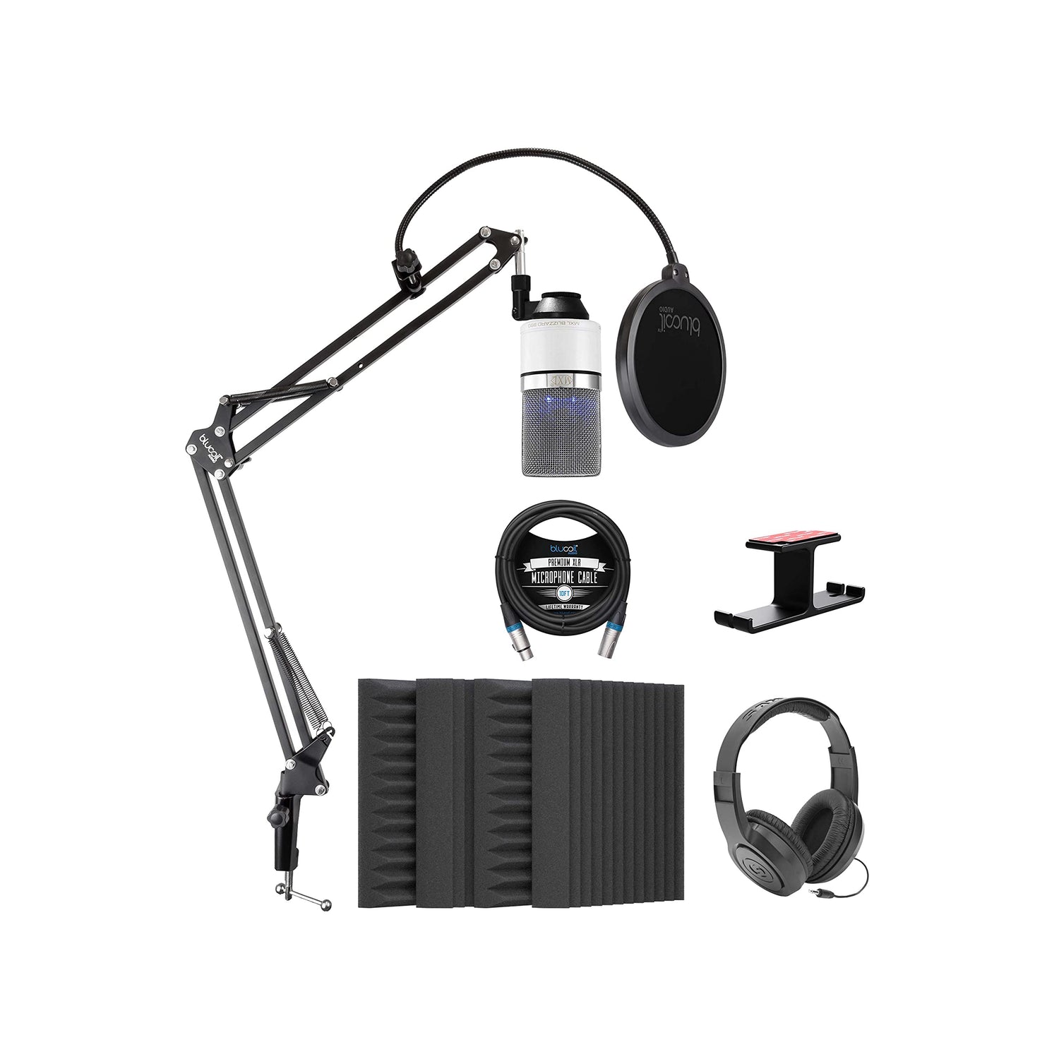 - INCLUDES - MXL 990 Blizzard Condenser Microphone with Blue LED Lights; Adapter for Mic Stand. 4-Pack of Blucoil 12-inch Acoustic Foam Isolation Panel Wedges with Adhesive Tapes. Blucoil 10-Foot Balanced XLR Cable - Premium Series 3-Pin Cable for Mics & Pro Devices (Male-to-Female). Blucoil All-in-One Microphone Boom Arm Plus Pop Filter. Samson SR350 Closed-Back Headphones. Blucoil Dual Suspension Headphone Hanger with 11-22 lb Weight Capacity - Universal Aluminum Holder for Headsets and Cables.