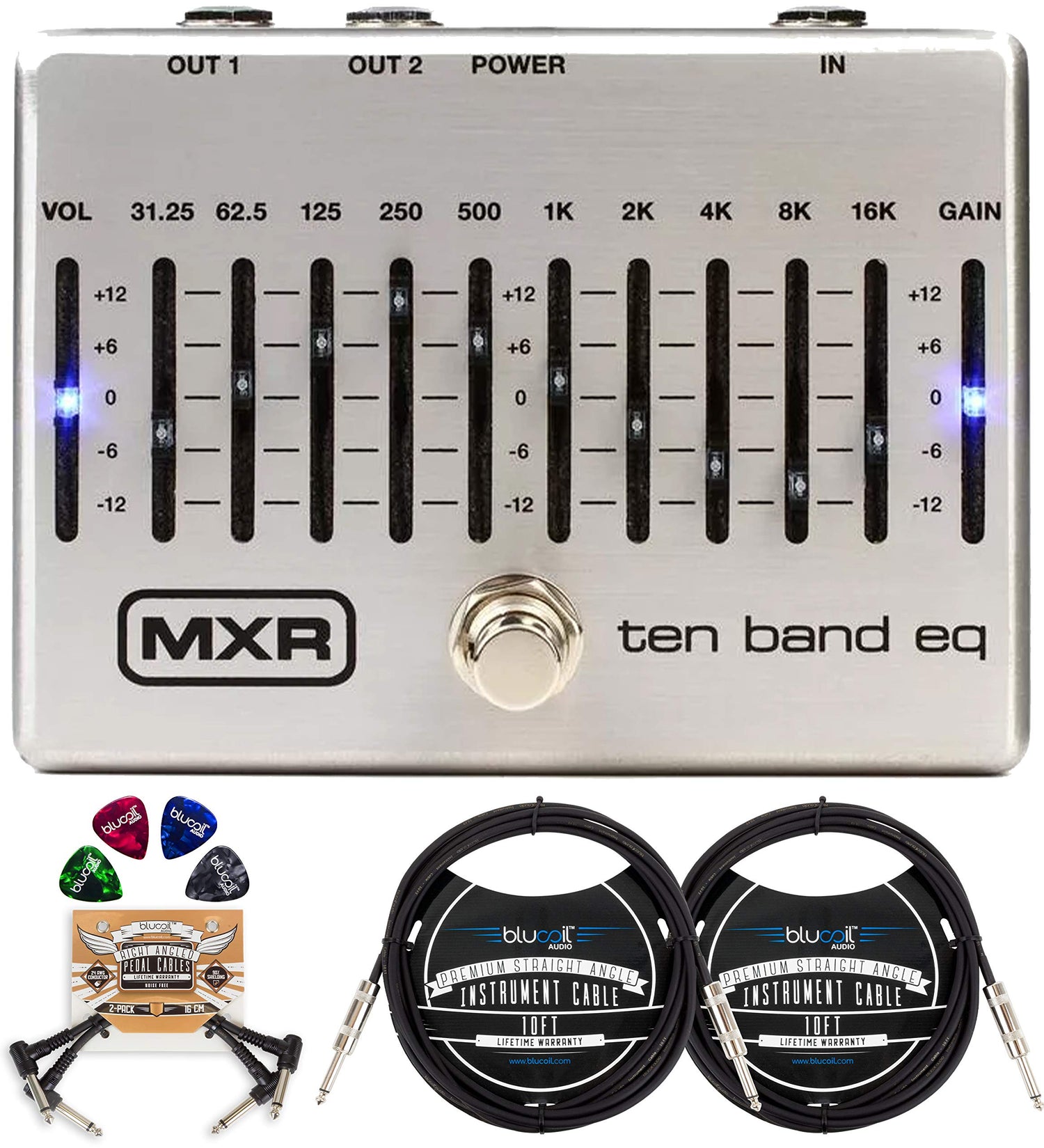 - INCLUDES - MXR M108S Ten Band EQ Pedal for Electric Guitar and Bass. 2-Pack of Blucoil Premium 10-FT Instrument Cables with 1/4" Straight Connectors and PVC Shield for Guitars and Amps. 2-Pack of Blucoil Right-Angled Patch Cables for Effects Pedals. 4-Pack of Blucoil Celluloid Guitar Picks with 0.71mm Gauge (Assorted Colors)