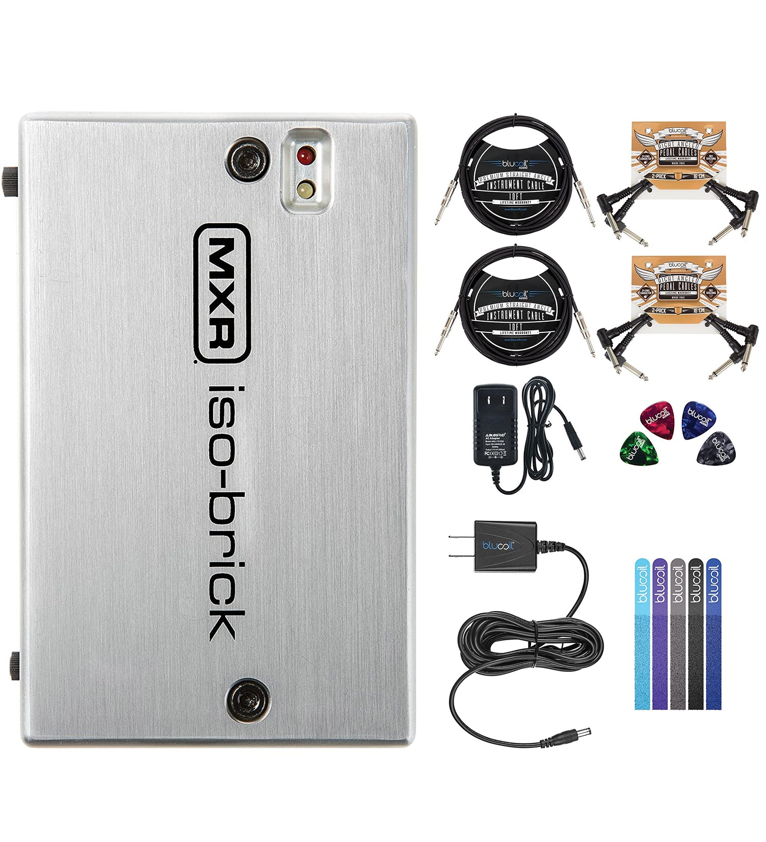 - INCLUDES - MXR M238 Iso-Brick Power Supply; 18V AC Adapter for Iso-Brick. Blucoil Power Supply with Slim AC/DC Adapter for 9 Volt DC 670mA with US Plug (Center Negative Polarity). 2-Pack of Blucoil Premium 10-Foot Instrument Cables with 1/4" Straight Connectors and PVC Shield for Guitars and Amps. 4-Pack of Blucoil Right-Angled Patch Cables for Effects Pedals. 4-Pack of Blucoil Celluloid Guitar Picks with 0.71mm Gauge (Assorted Colors). 5-Pack of Blucoil Reusable Velcro Cable Ties.