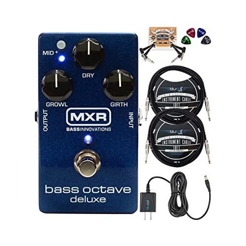 Details: MXR M288 Bass Octave Deluxe Pedal The MXR M288 is a dual-voice octave stompbox, which delivers organic analog tones. The compact unit features Constant Headroom Technology that provides exceptional tracking and headroom. You can shape your overall sound with throaty tone (Growl) or deep tone (Girth) by mixing the two separately-controlled knobs. TECHNICAL SPECS: Bypass: True Hardwire Impedance: 1 MOhm Input, Less than 600 Ohm Output Noise Floor: 85dB Octave Bandpass: -3dB, 8~46Hz Control Range (Infinity to): +2.5dB Dry | +1dB Girth | +6dB Growl Gain MID+ Switch: +4 to +14dB Frequency MID+ Switch: 400~850Hz Power Source: 9V Battery or 9V Adapter Current Draw: 14mA Connectors: 1/4" Input, 1/4" Output Size (LxWxH): 5.8 x 4.5 x 2.8" Weight: 0.75 LB Also Comes With: Blucoil 9V 670mA Power Supply The 9V Power Supply ensures the correct amount of power gets transmitted to your electronic devices. It offers protection against short circuits, over-temperature, over-current, and over-voltage. The power supply features an extra-long 3m cable and a universal input voltage range of 100-240V ~ 50/60Hz. It works with a wide range of effects pedals like MXR M169 Carbon Copy, M116 Fullbore Metal as well as tip-negative electronic musical instruments that need the same amp requirements and voltage. Blucoil 10-FT Straight Instrument Cables (2-Pack) The Blucoil 10-Foot Instrument Cable features 1/4" male to 1/4" male straight mono plugs, which interconnect your electronic instruments (e.g., guitars, bass, keyboards) to a preamp or amplifier's unbalanced input. Its metal Neutrik connectors ensure reliable durability and improved contact integrity. The cords are protected with conductive PVC shielding, which cancels out electrical interferences. Get this bundle and receive 2-Pack of Blucoil Right-Angled Patch Cables and 4-Pack of Celluloid Guitar Picks!