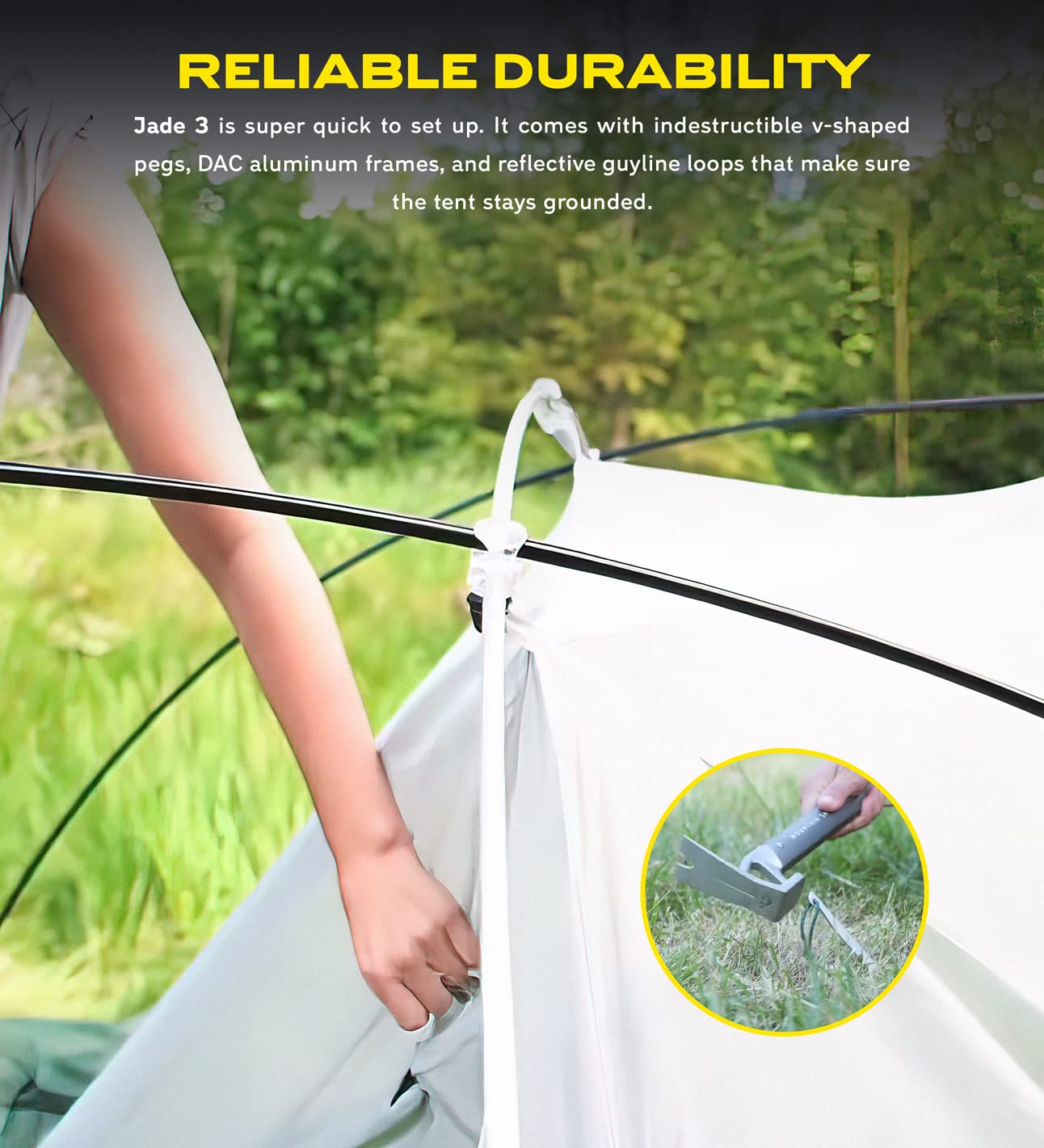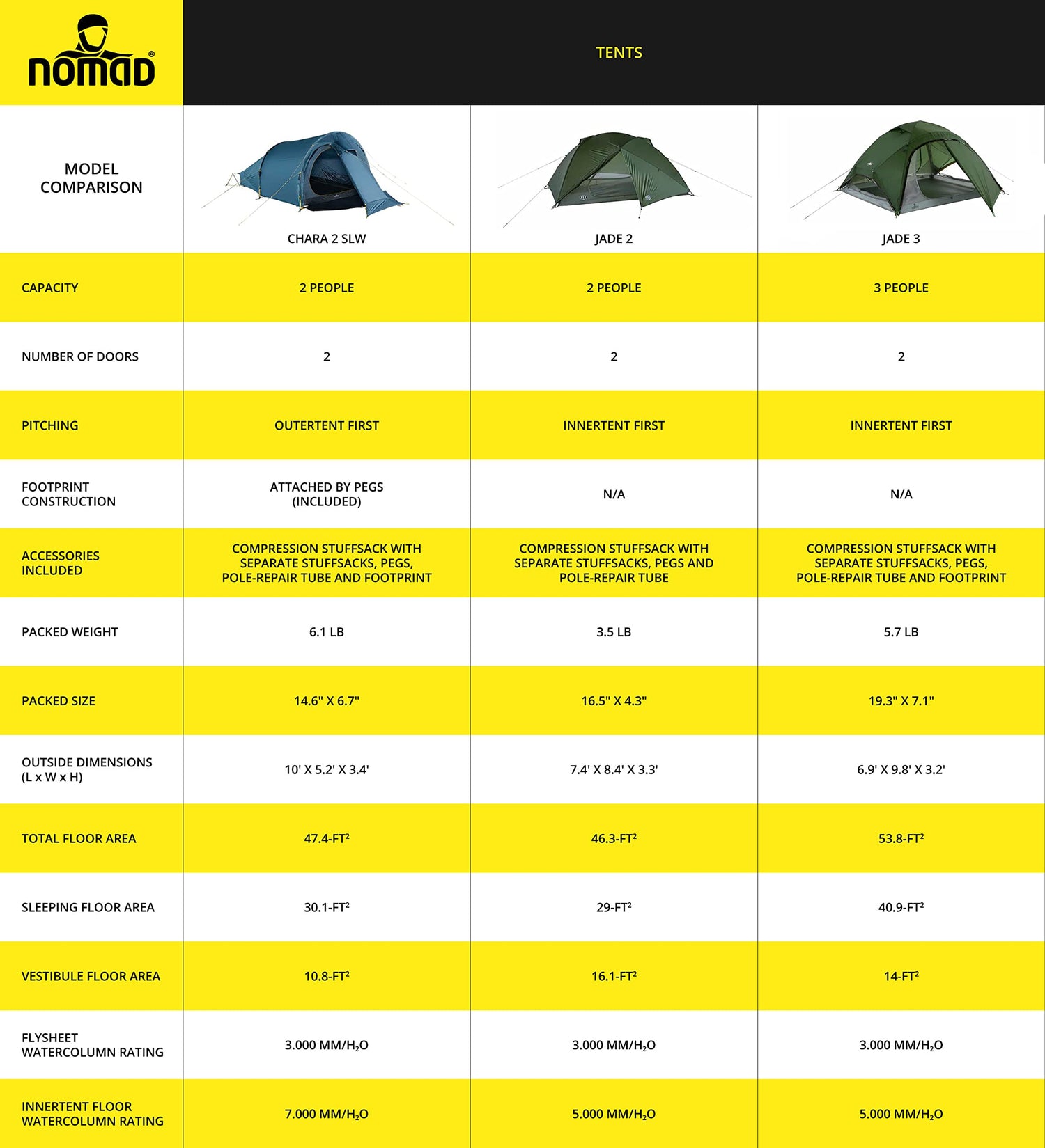 - TRAVEL LIGHT, REST SOUNDLY - The NOMAD Jade 3 is a 3-person tent with a compact 5.71 LB weight. Its inner tent is made with breathable and water resistant ripstop nylon. The total floor area is 54-sq ft. while the sleeping area is 41-sq ft.
