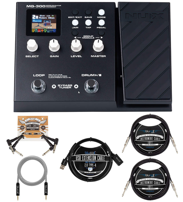 Details: NUX MG-300 Multi-Effects Pedal The compact NUX MG-300 Pedal is a powerful and realistic modeler equipped with lots of features. It utilizes TSAC-HD (True Simulation of Analog Circuit) Pre-Effects and Amp Modeling algorithm plus CORE-IMAGE Post-Effects Sound Library to deliver optimum sound response and playability. You can quickly edit the pedal's patches via the interactive Quick Tone Edit Software. MG-300 has multi-functional sensitive footswitches and a built-in tuner. It even has an onboard loop station that records in 24bit high quality. You can activate the Looper function by pushing the JAM button. MG-300 also has 3 Global EQs for quick adjustments during live performances. You can also plug an MP3 player in the 3.5mm stereo Auxiliary Input or connect it to a Mac/Windows PC for updating the pedal's firmware. TECHNICAL SPECS: A/D Converter: 32bit Sampling Frequency: 48kHz Supported Format: WAV Loop Station: 24bit Resolution, 56 Drum Beats, 60-seconds Phrase Loop Recording Time Frequency Response: 20Hz-20kHz +/-1dB THD+N: Less than 0.03% Dynamic Range: 110dB Input: -20dB | Output: -10dB Connectors: 1/4" Input, 1/8" Aux In, 1/4" Output, USB Micro-B Power Source: 9V Power Supply Weight: 1.7 lbAlso Comes With:Blucoil 10-FT Straight Instrument Cables (2-Pack)The Blucoil 10-foot instrument cable interconnects your electronic musical instruments (e.g., guitars, bass, keyboards) to a preamp or amplifier's unbalanced input. It features 1/4" male to 1/4" male straight mono plugs. The metal Neutrik connectors ensure reliable durability and improved contact integrity. The cords are protected with conductive PVC shielding, which cancels out electronic and RF interference.Get the MG-300 Bundle today and receive these Blucoil exclusives: 2-Pack of Blucoil Right-Angled Pedal Patch Cables 5-Foot Audio Aux Cable 3-Foot USB 2.0 Type-A Extension Cable