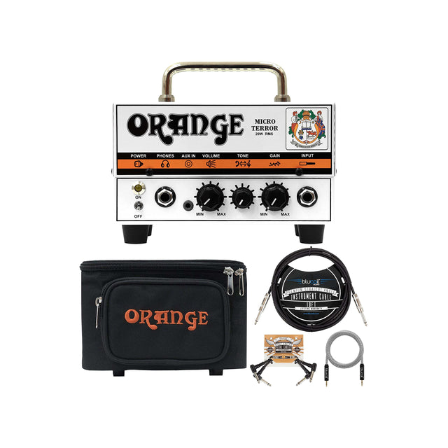 Details: Orange Amps Micro Terror 20W Guitar Amplifier HeadThe Micro Terror Head gives big Orange Amps tone in a teeny-tiny package. It features a hybrid 20W RMS Solid State power amplifier and 12AX7/ECC83 preamp. Micro Terror provides classic British tones from chimey cleans to pummeling overdrives. You can also use this amp head for solo practices. Simply plug a CD player in the aux input and play along note-for-note. Use the headphones output when you want to practice quietly. NOTE: Speaker Output is muted/bypassed when the headphone is in use. If you'll not use the headphone jack, a suited speaker cabinet must be plugged in always during usage.TECHNICAL SPECS:Output Power: 20 Watts RMSPreamp Valves: ECC83/12AX7Speaker Output: 8 Ohm MinimumConnectors: 1/4" Inst In, 1/8" Aux In, 1/4" Speaker Output, 1/4" HeadphonesPower Source: DC Power Supply (INCLUDED)Size (DxWxH): 3.7 x 6.5 x 5.3"Weight: 1.87 lbAlso Comes With:Orange Amps Viny Travel BagSafely transport your Micro Terror Amp Head with the nifty Orange Micro Travel Bag. It features vinyl exterior, padded dividers, and a detachable shoulder strap. There's ample space for your power supply, cables, and other trinkets. You can fit one Orange Amps Micro Terror, Micro Dark, or Micro Crush in the main compartment and other gig essentials in the front pouch.Blucoil 10-FT Straight Instrument CableThe Blucoil 10-foot instrument cable interconnects your electronic musical instruments (e.g., guitars, bass, keyboards) to a preamp or amplifier's unbalanced input. It features 1/4" male to 1/4" male straight mono plugs. The metal Neutrik connectors ensure reliable durability and improved contact integrity. The cords are protected with conductive PVC shielding, which cancels out EMI/RFI.Get this bundle today and receive these Blucoil exclusives5-Foot Audio Aux Cable2-Pack of Right-Angled Pedal Patch Cables