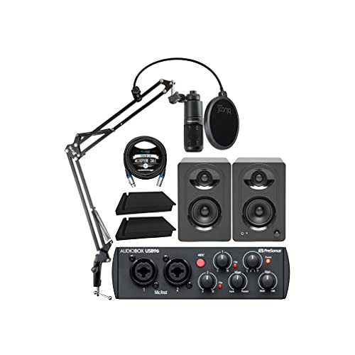PreSonus AudioBox USB 96 25th Anniversary Audio Interface Bundle with Audio-Technica AT2020 Microphone, MediaOne M30 Monitors, Blucoil Boom Arm Plus Pop Filter, 2x Isolation Pads, and 10' XLR Cable